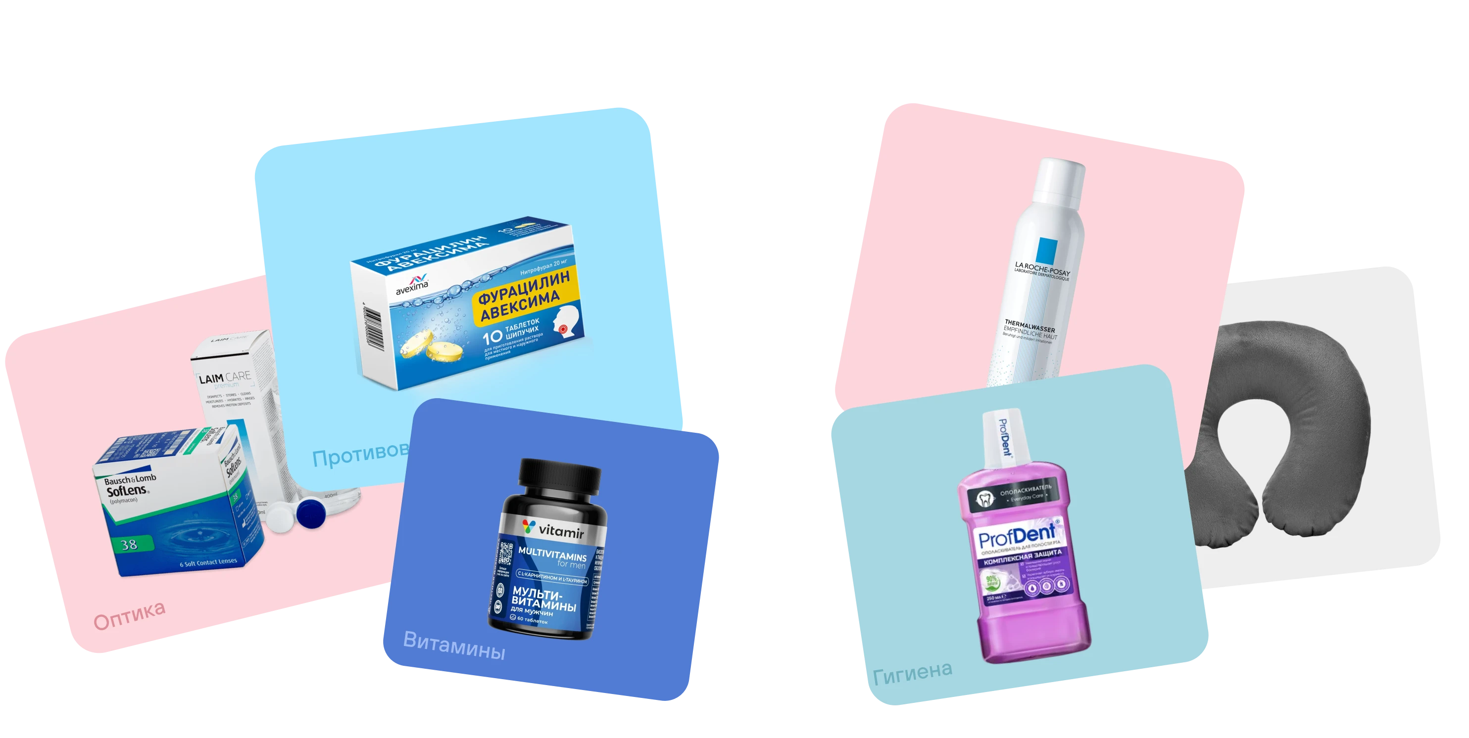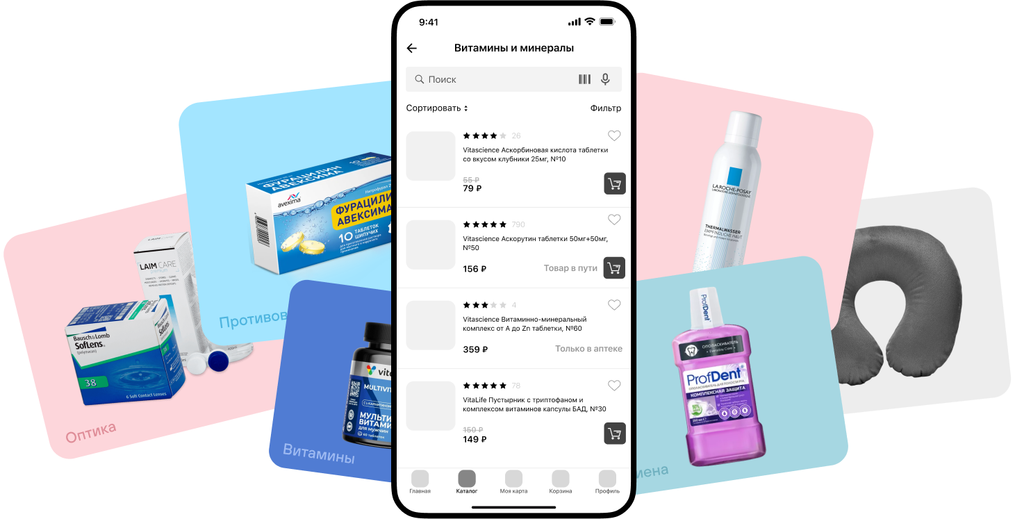 Допродажи — большая часть выручки аптеки. Поэтому на главном экране помимо поиска, карты лояльности и информации о заказах, показываем персональные предложения, БАДы и уходовые средства