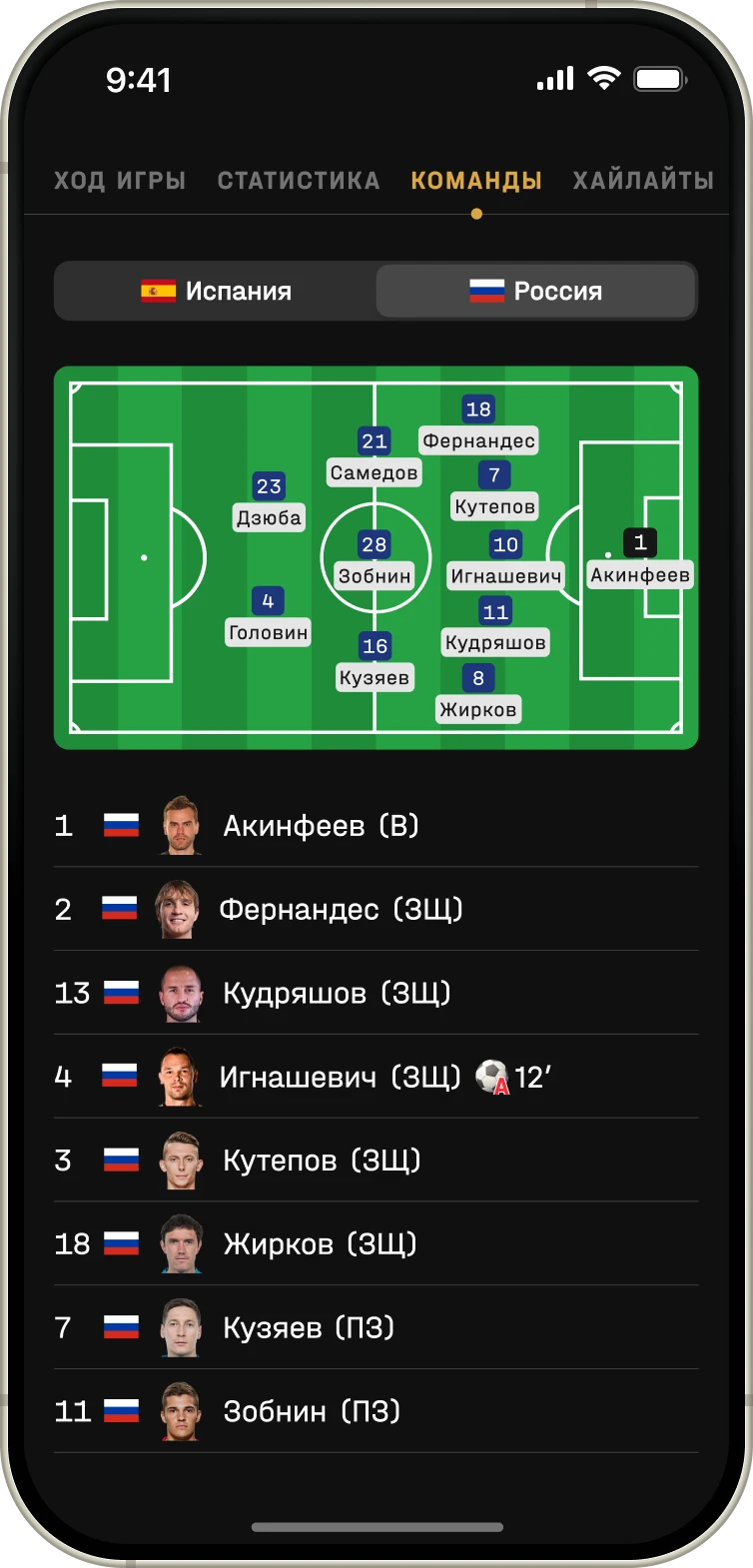 В разделе «Спорт» можно посмотреть состав команд, статистику, ход игр и результат каждого события.