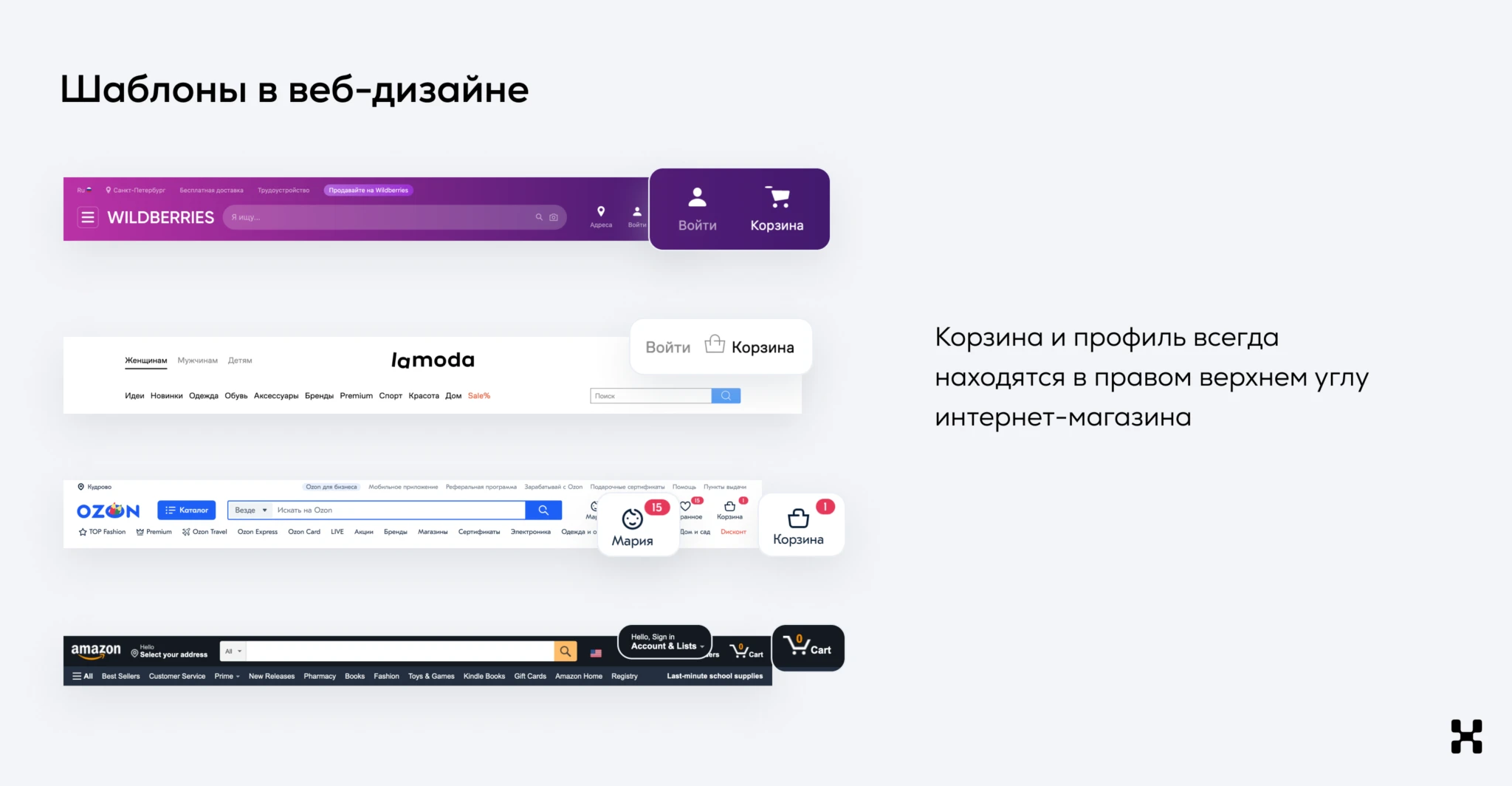 Как использовать в дизайне. На большинстве сайтов интернет-магазинов профиль пользователя и корзина находятся в правом верхнем углу. Когда пользователь заходит на новый сайт, он ожидает увидеть их там.