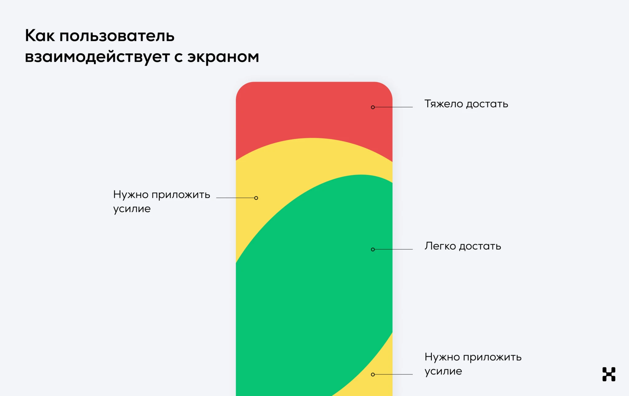 В «зеленой» зоне пользователь работает без затруднений, в «желтой» зоне прикладывает усилия. Чтобы достать до «красной», пользователь меняет положение телефона в руке и тянется пальцем.