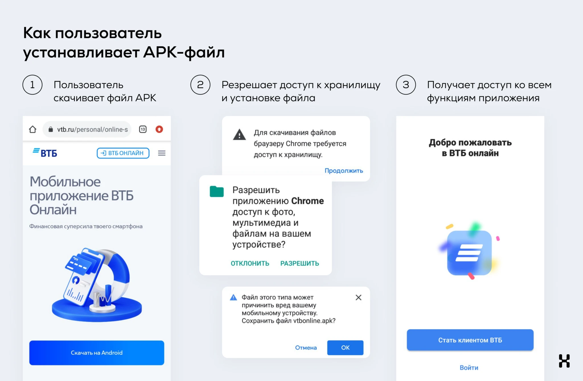 Компания может разместить APK-файл на официальном сайте. Например, так сделал Банк ВТБ, когда Google Play удалил его приложение из каталога. ВТБ разместил ссылку на скачивание APK-файла и объяснил, как его установить. Также поступили «Сбер» и «Открытие», которые попали под санкции.