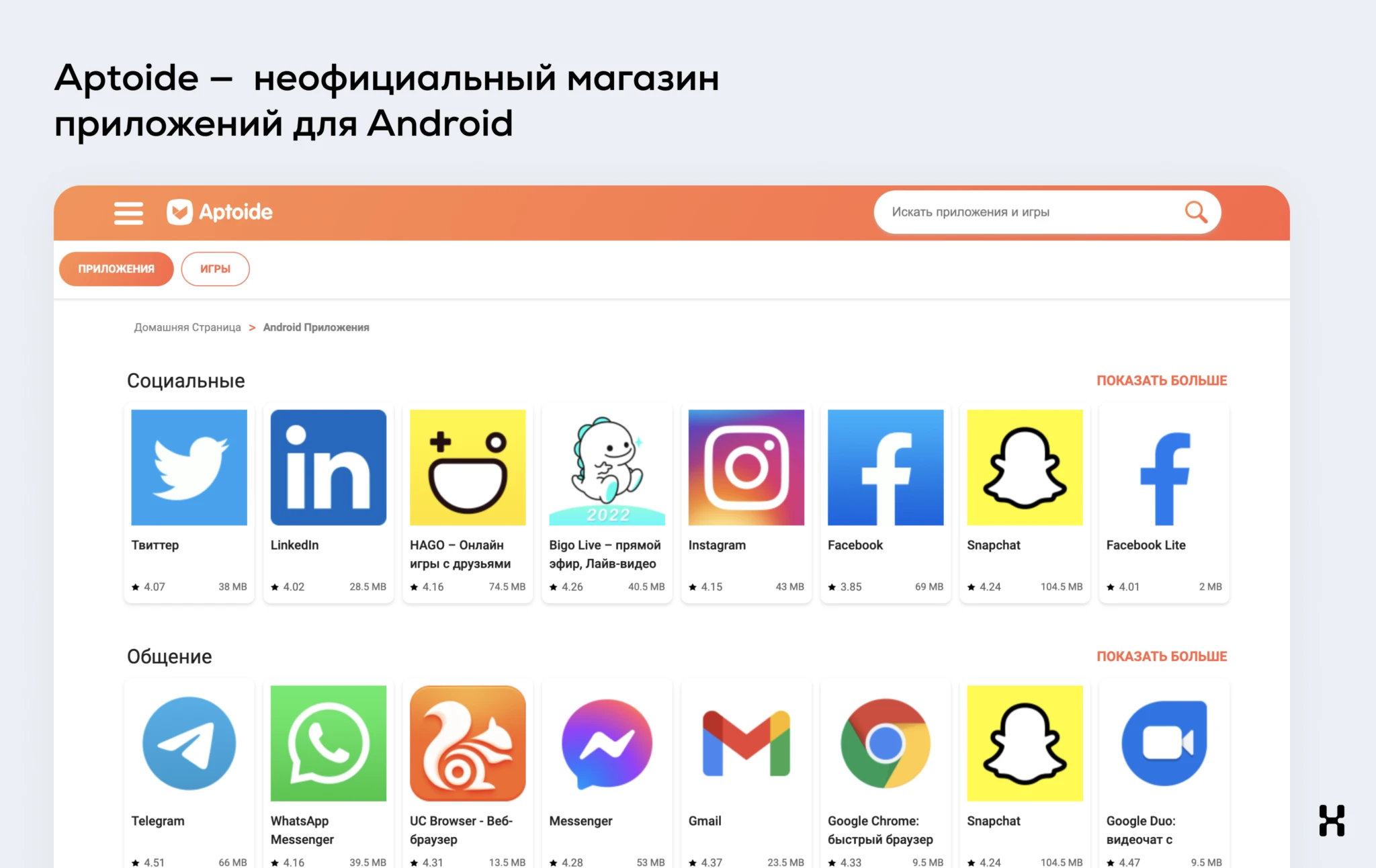 Компания также может разместить APK-файл в каталоге неофициального стора. Самый крупный аналог Google Play c открытым исходным кодом — Aptoide. Он объединяет 300 млн пользователей и 1 млн приложений, предлагает скачивать приложения без регистрации, обновлять их и возвращать к предыдущим версиям.
