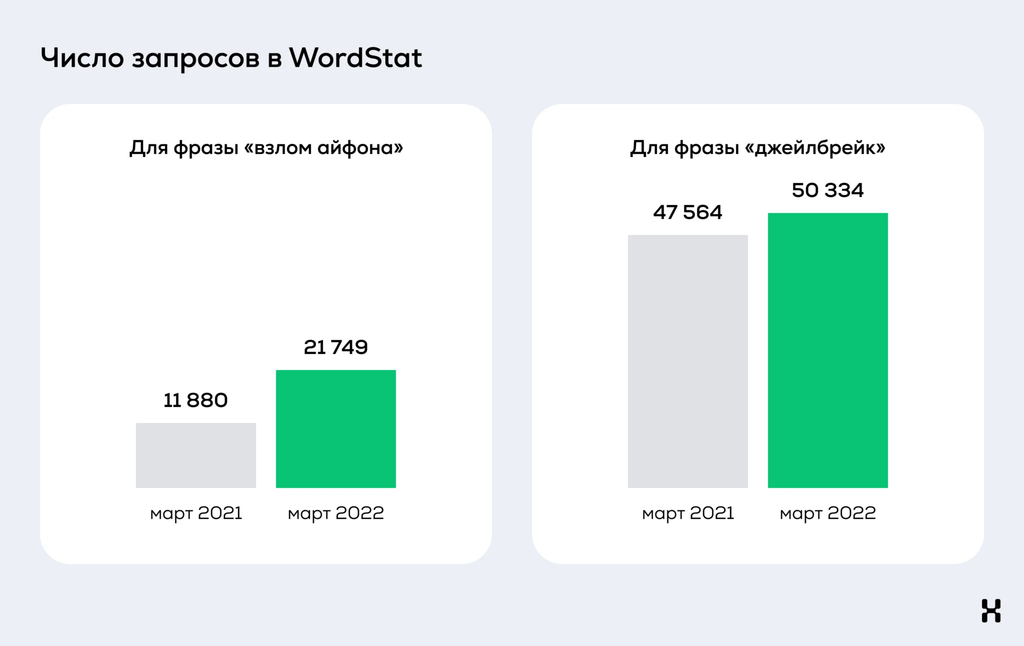 В марте пользователи Яндекса искали «взлом айфона» почти 22 тысячи раз, а «джейлбрейк» — почти 51 тысячу раз.
