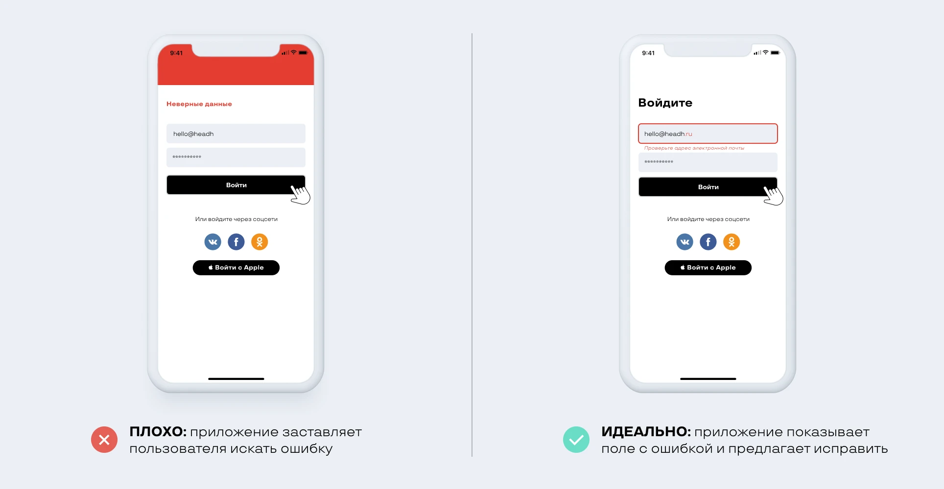 Если пользователь ввел данные неверно, укажите где ошибка. Сообщение «Вы неверно заполнили поля» — недопустимо. Мозг приложения знает, где ошибка. Пусть он сообщит это пользователю и подумает за него: