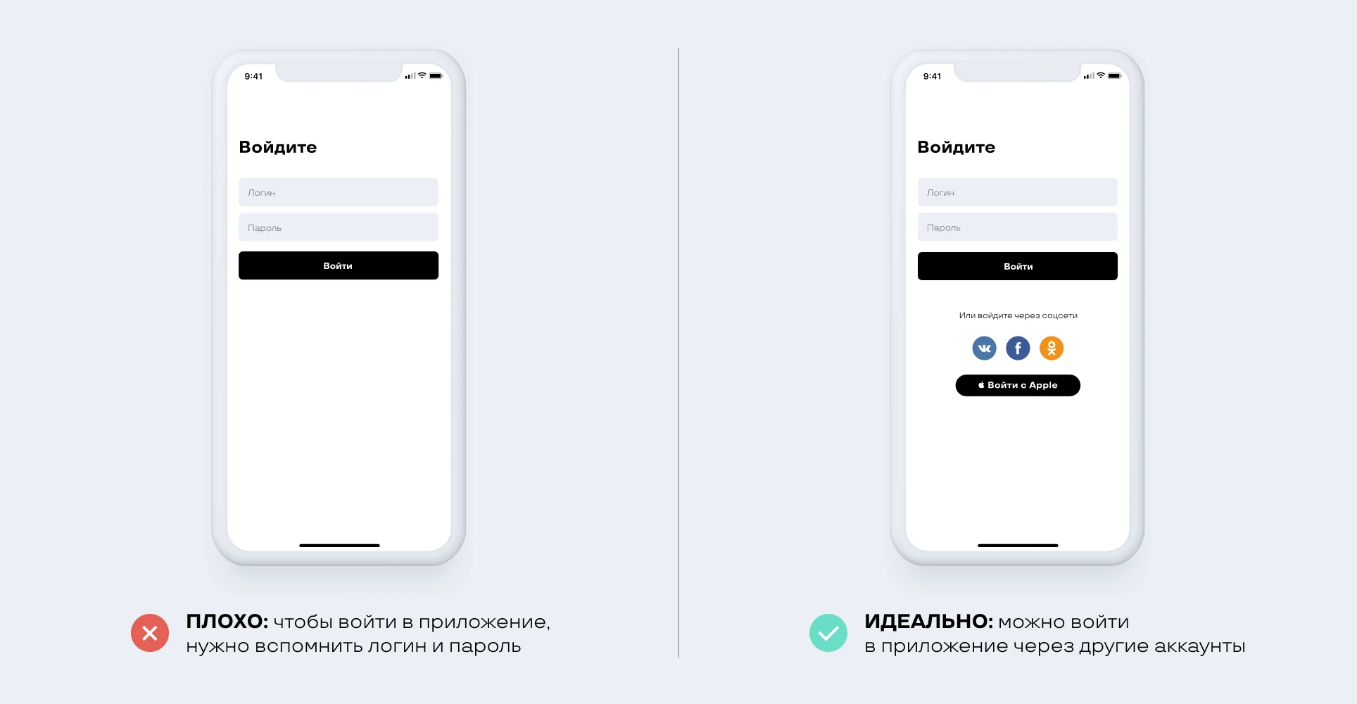 Стандартный логин и пароль успешно заменяет авторизация через аккаунты экосистем: Google, Facebook, Одноклассники, ВКонтакте и Apple ID. Вход ускоряется и упрощается, потому что пользователю не нужно вспоминать логин, пароль и заполнять поля. 93% пользователей выбирают именно авторизацию через соцсети вместо входа через электронную почту — данные LoginRadius. Так владельцы приложений увеличивает конверсию и получают доступ к личной информации пользователей. А если в приложении настроены возможности шерринга, то пользователи делятся контентом в соцсетях и повышают реферальный трафик: