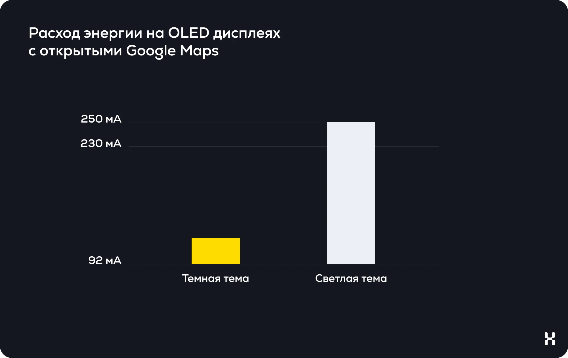 Pixel с OLED-дисплеем в темном режиме расходовал энергии почти в три раза меньше, чем в светлом. А iPhone 7 расходовал 230 мА в обоих режимах. Таким образом включенный темный режим на OLED-дисплеях позволил сэкономить 63% заряда.