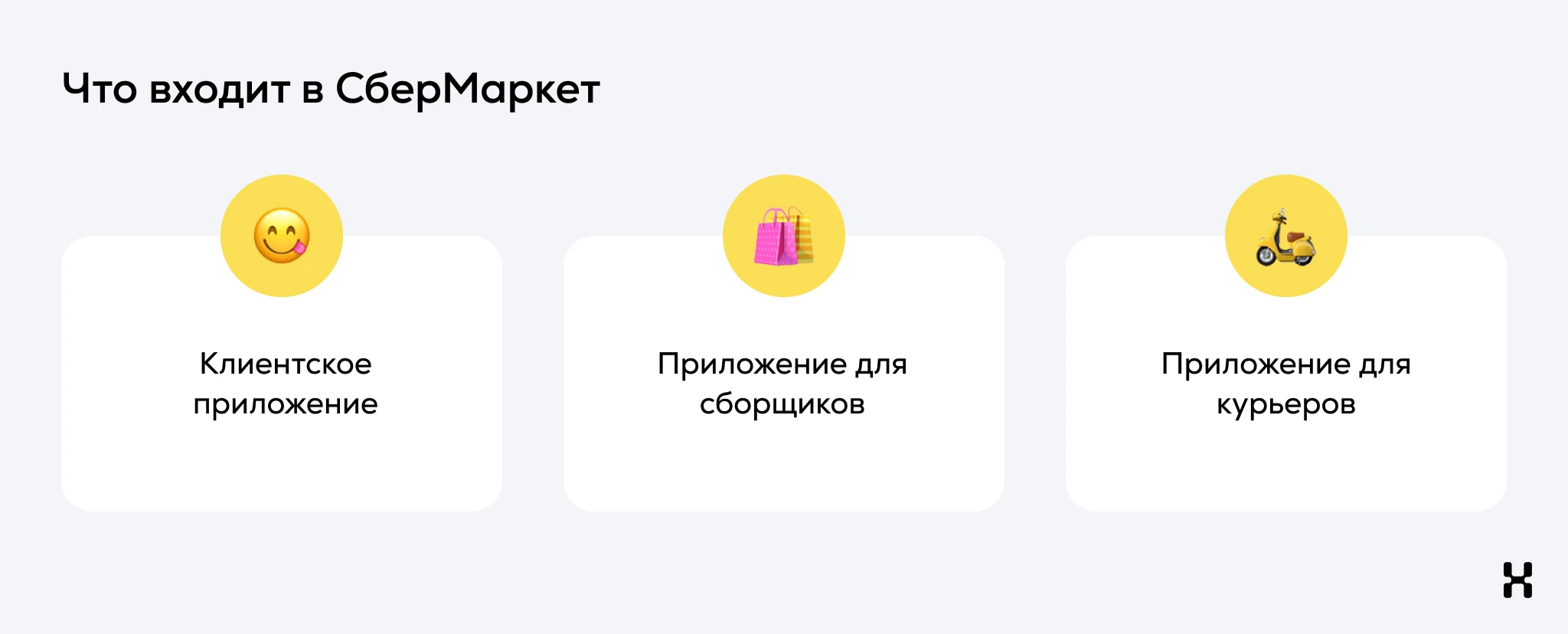 В СберМаркет входит клиентское приложение, приложение для сборщиков и приложение для курьеров. Пользователь заходит в приложение и добавляет заказ в корзину. Затем заказ попадает в приложение для сборщиков и они собирают его в магазине. Потом отправляют информацию в приложение для курьеров, там его принимают водители и доставляют клиенту.