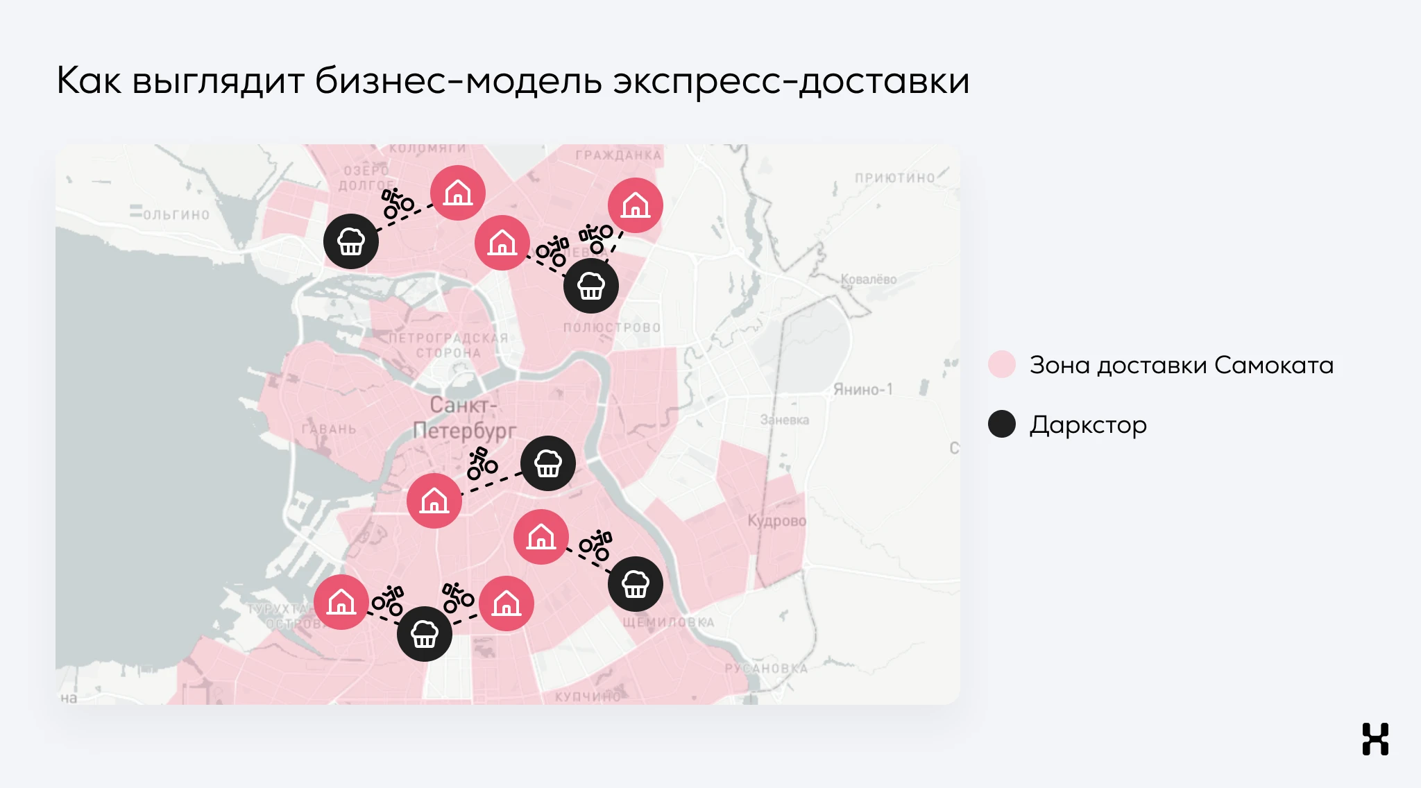 Сервисы экспресс-доставки продуктов и готовой еды до двери используют дарксторы — склады с товарами, расположенные в жилых районах. Широкая сеть даркосторов позволяет сервису доставлять заказы до двери в течение 15 минут. По такому принципу в России работают Яндекс.Лавка и Самокат.