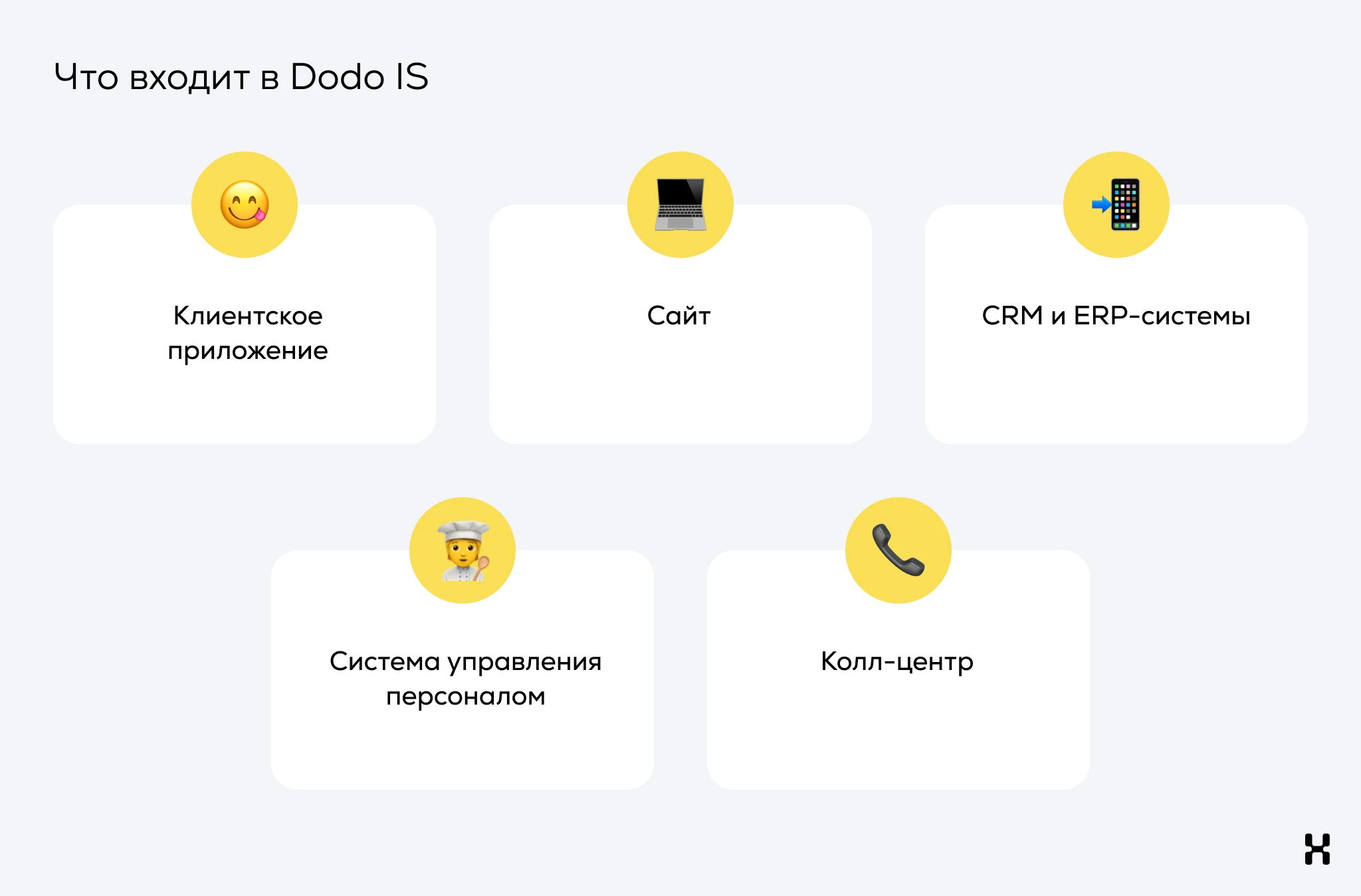 В Dodo IS входит мобильное приложение, сайт, CRM и ERP— системы, система управления персоналом и колл-центр. Основа Dodo IS — это трекер заказов. Пользователь заказывает пиццу через мобильное приложение, в колл-центре, на сайте или на кассе. Все заказы сразу же появляются на планшетах, установленных на кухнях. Повара готовят заказ и фиксируют все свои действия на планшете.
