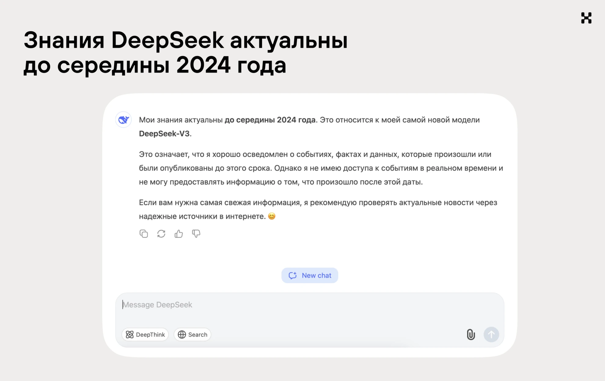 Нейросети не всегда работают с живым интернетом. Например, в августе 2025 DeepSeek оперирует базой знаний, актуальной на июнь 2024 года. Чтобы получить от нее свежую информацию, нужно включить специальную функцию поиска в интернете.
