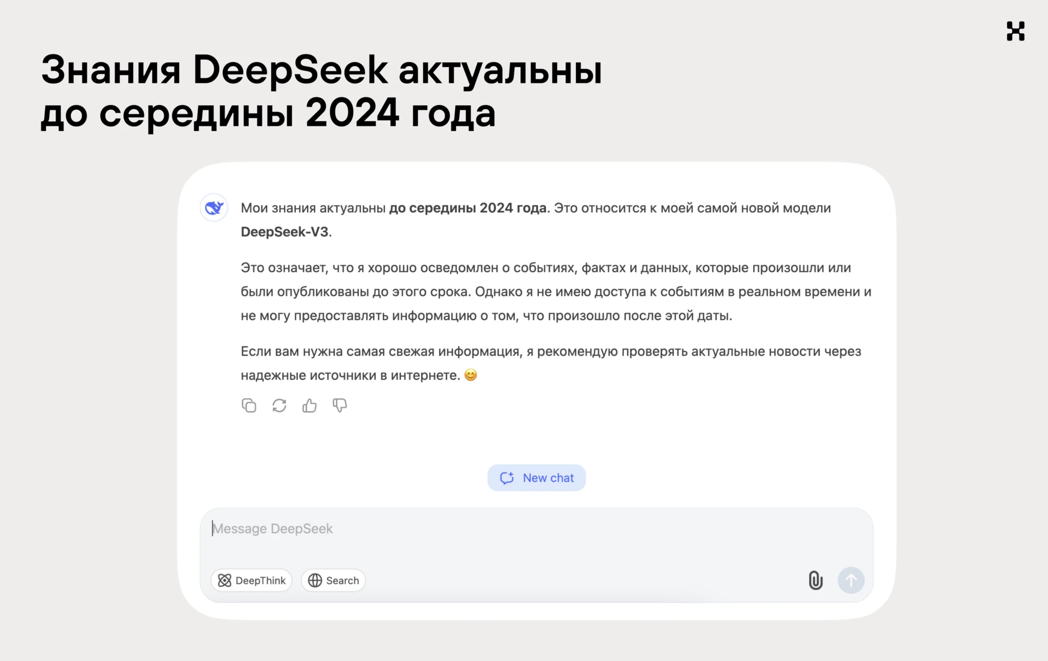 ИИ не всегда работает с живым интернетом. Например, в августе 2025 DeepSeek оперирует базой знаний, актуальной на июнь 2024 года. Чтобы получить от нее свежую информацию, нужно включить специальную функцию поиска в интернете.
