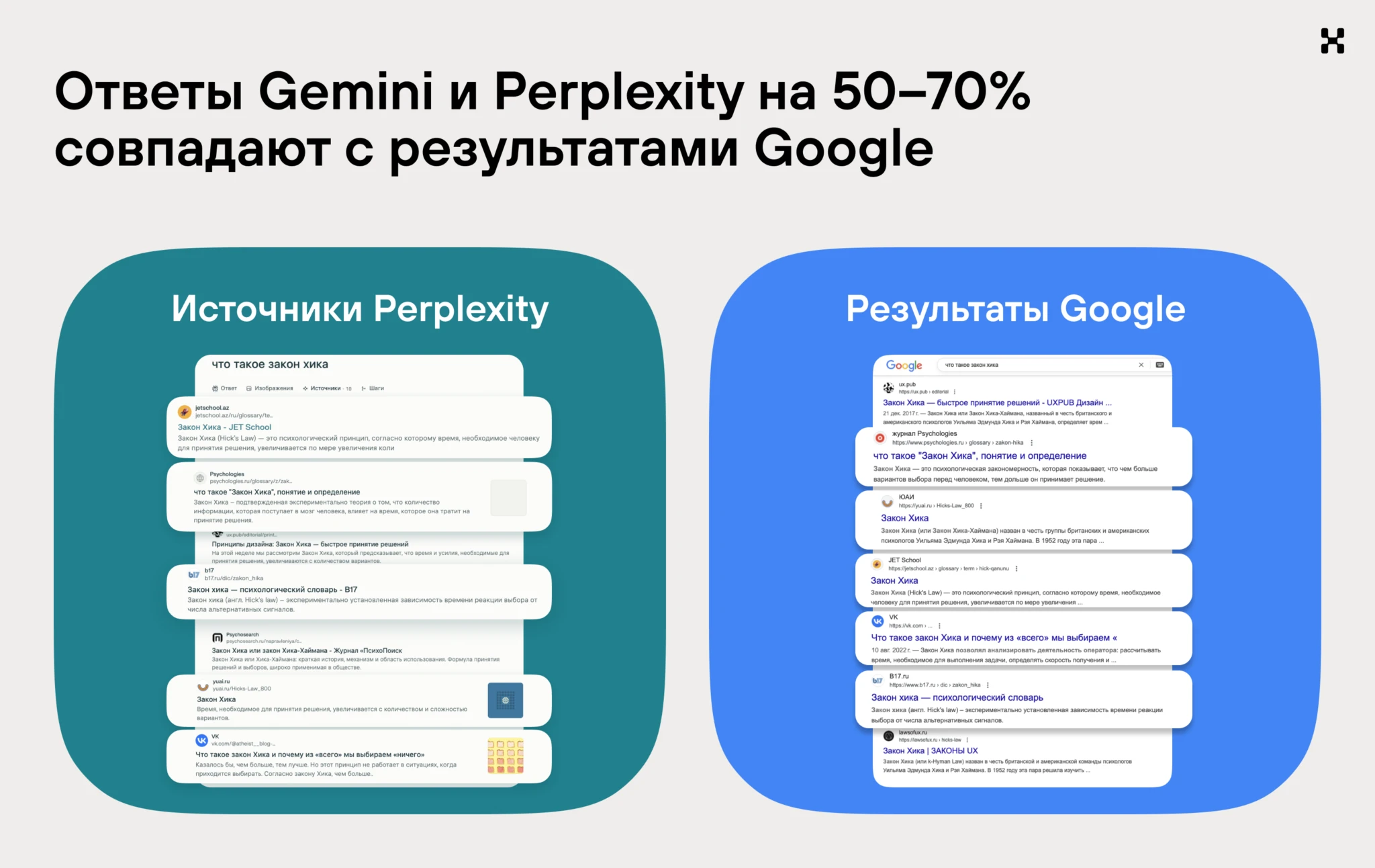 Часто источником становится первая десятка источников из поисковой выдачи. Например, ответы Gemini и Perplexity на 50–70% совпадают с результатами Google.