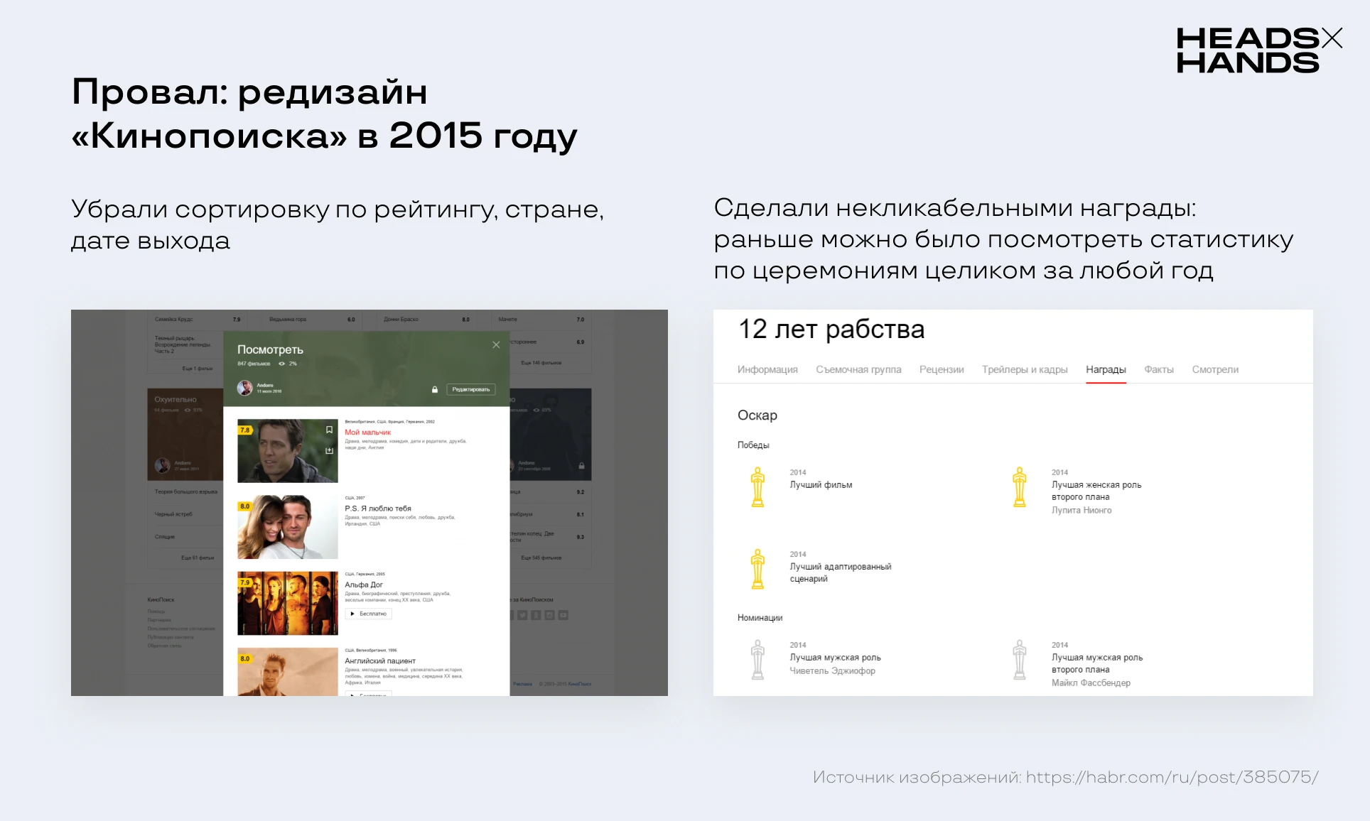 Когда Яндекс купил Кинопоиск, команда сделала редизайн сайта и выпустила обновление без анонса и возможности вернуться к старому интерфейсу. Пользователи взбунтовались. Яндексу пришлось вернуть старый дизайн, а новый поместить на отдельном домене как бета-версию — так надо было сделать с самого начала.