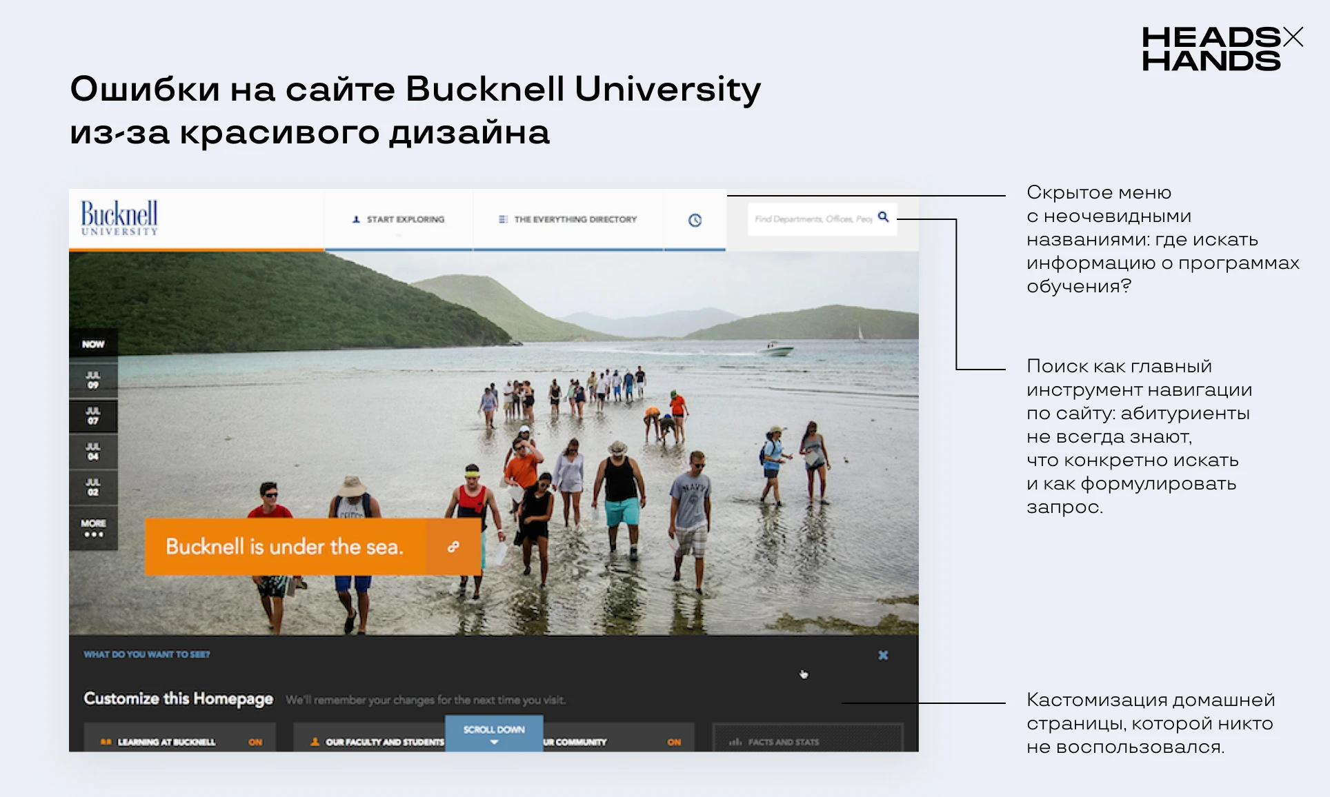 Университет Бакнелла обновил сайт: при разработке нового интерфейса дизайнеры заигрались с трендами и забыли про потребности пользователей. В итоге получился симпатичный, но неудобный сайт.