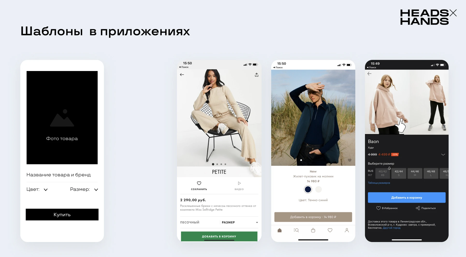 В большинстве приложений с одеждой и обувью карточка товара строится одинаково: изображение, название товара, выбор размера и цвета, добавить в корзину . Пользователь привык к такой карточке: если он увидит ее в новом приложении, то сможет беспрепятственно выбрать нужные параметры товара и отправить его в корзину.