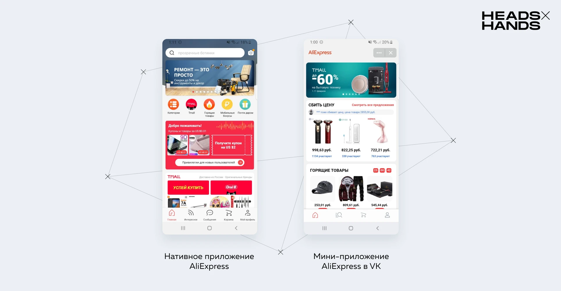 Мини-аппы «ВКонтакте» как дублируют нативные приложения, так и являются полностью оригинальными. К первым относится миниапп AliExpress, в котором можно искать и покупать товары через социальную сеть.