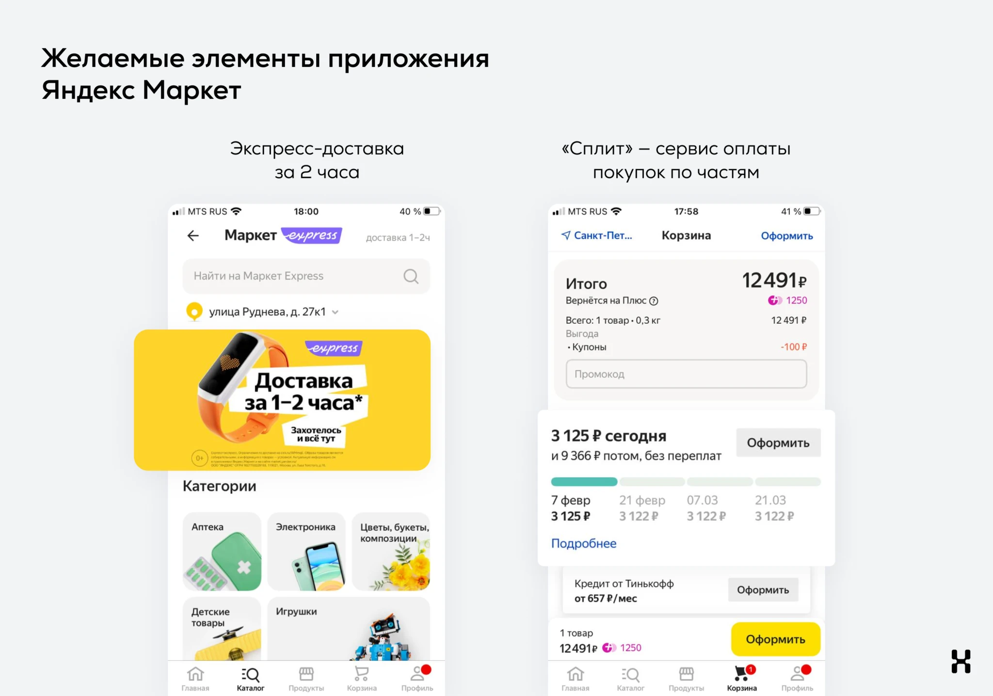 Другой пример желаемого элемента — сервис «Сплит». Он предлагает пользователю оплатить покупку частями без переплат. Клиенты пользовались Маркетом и до внедрения сервиса, но когда он появился, стали покупать в 1,5 раза больше. Потому что теперь на крупные покупки не нужно откладывать месяцами.