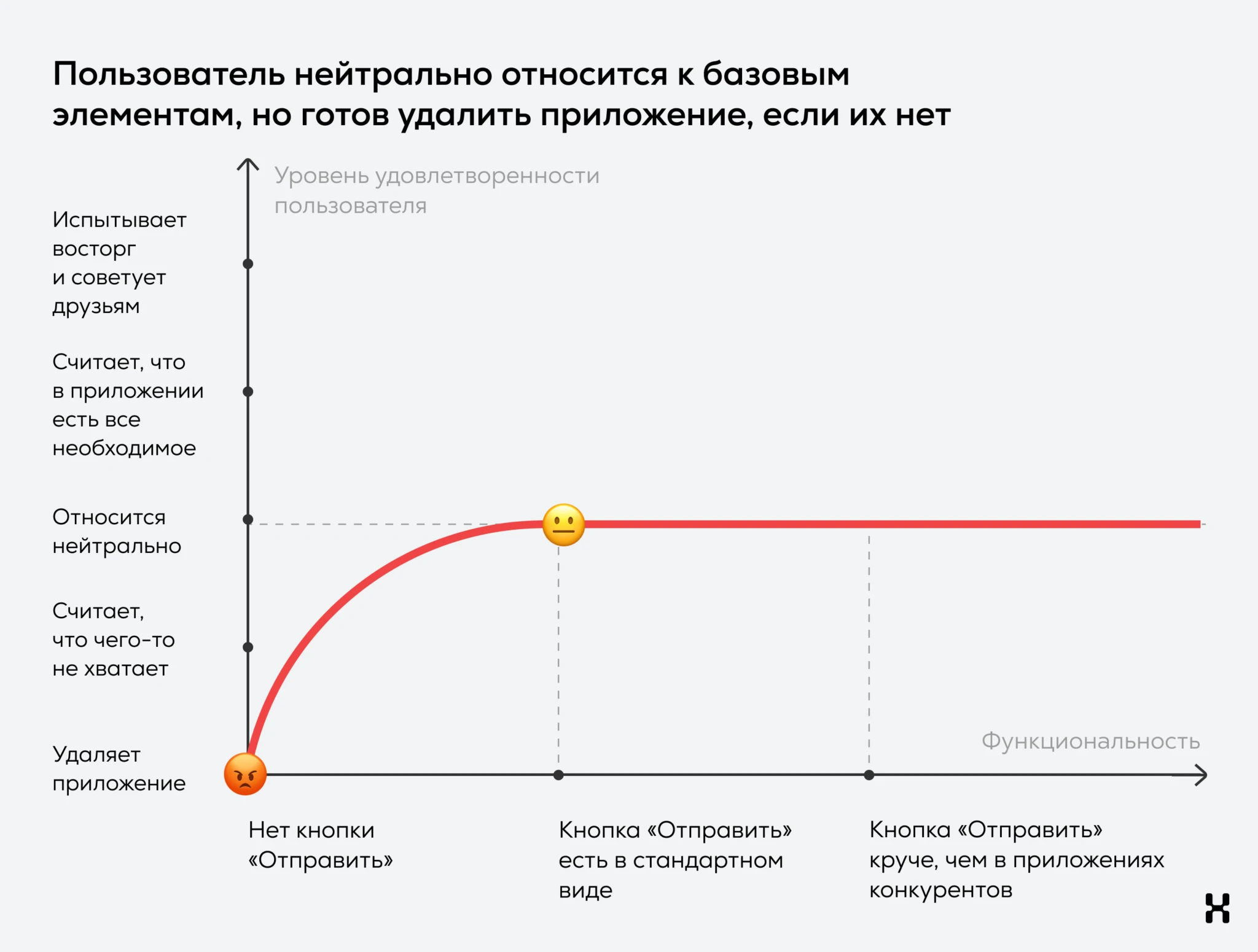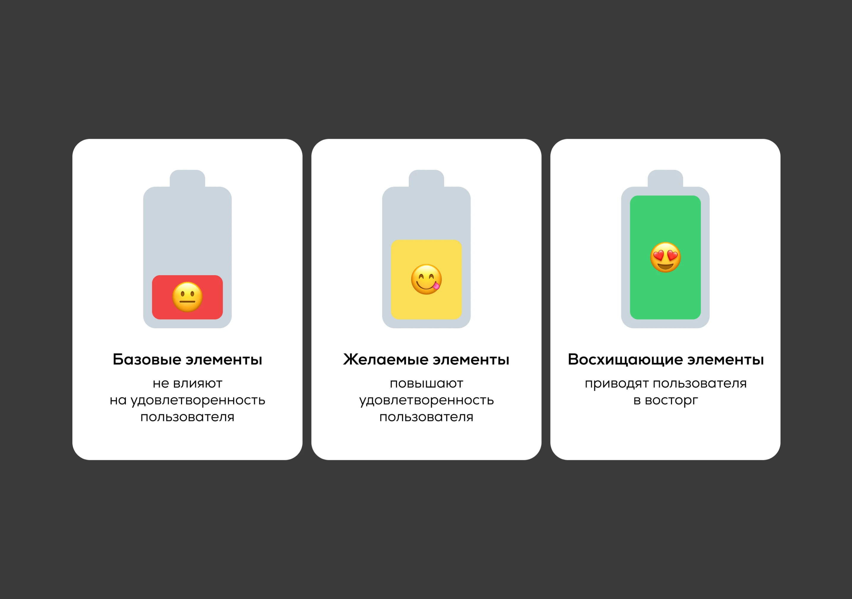 Модель Кано — это метод оценки эмоциональной реакции пользователей на элементы приложения. По модели Кано UX-дизайнеры делят элементы на 3 группы: базовые, желаемые и восхищающие. Первая группа определяет жизнеспособность приложения, а вторая и третья — его конкурентоспособность.