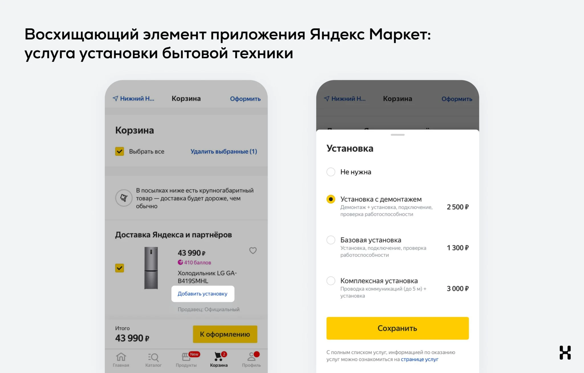 Другой восхищающий элемент в интерфейсе Маркета — функция установки бытовой техники. Маркетплейс рассчитывает цену услуги по выбранным параметрам и назначает на заказ мастера из Яндекс Услуг. Так он сопровождает пользователя от выбора товара до его подъема и установки, а также избавляет клиента от процесса выбора подрядчиков на стороне.