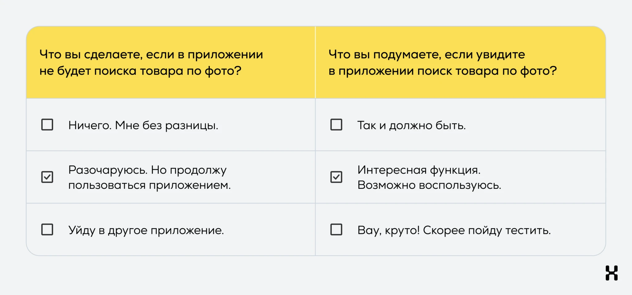 Пока клиенты изучали материалы, UX-дизайнеры сделали опросник по Кано. Они составили два вопроса по каждой характеристике и добавили к ним варианты ответов.