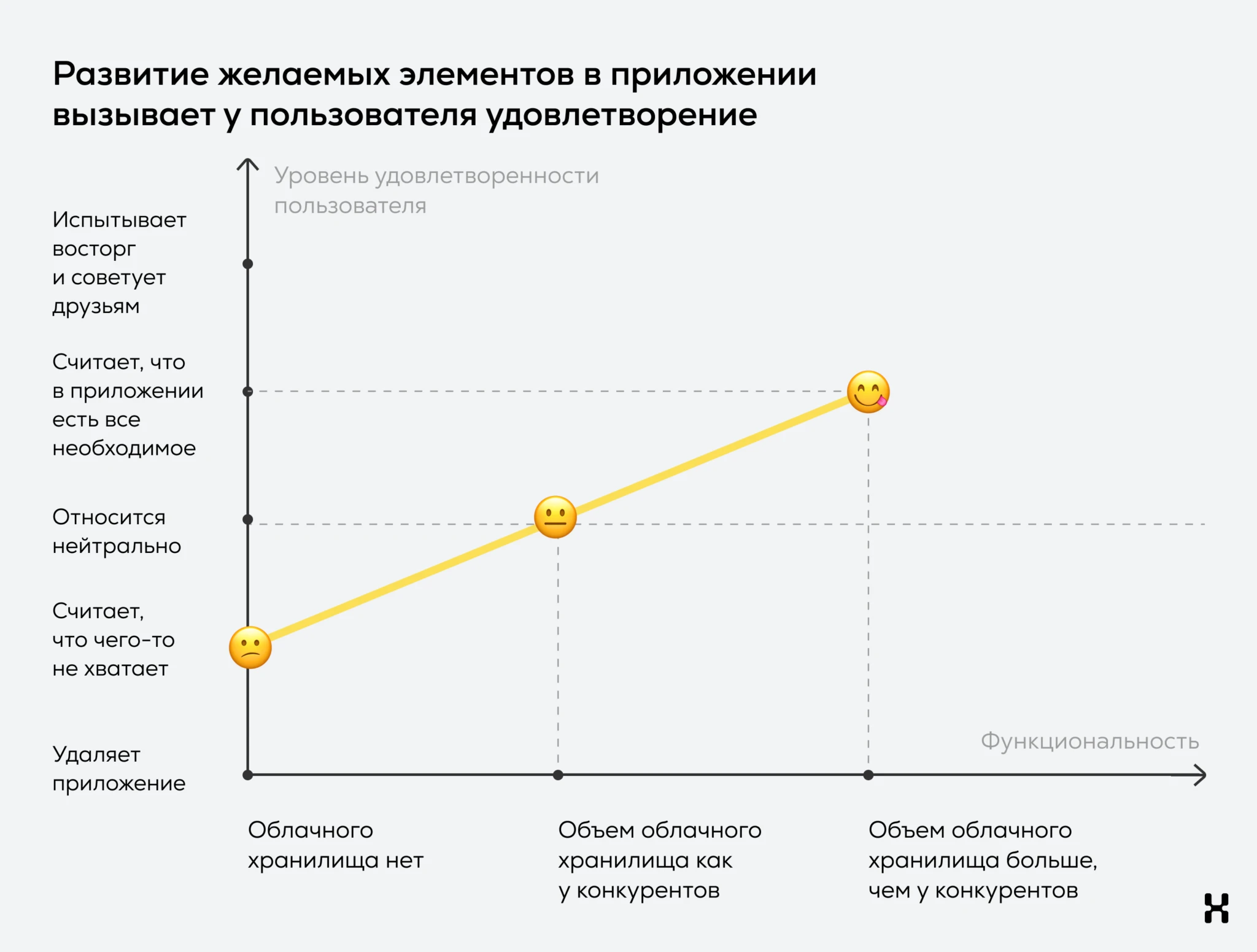 Желаемые элементы поддерживают ожидаемый уровень сервиса и помогают выделить приложение среди конкурентов. Чем лучше развиты желаемые элементы в приложении, тем выше пользователь его оценит.
