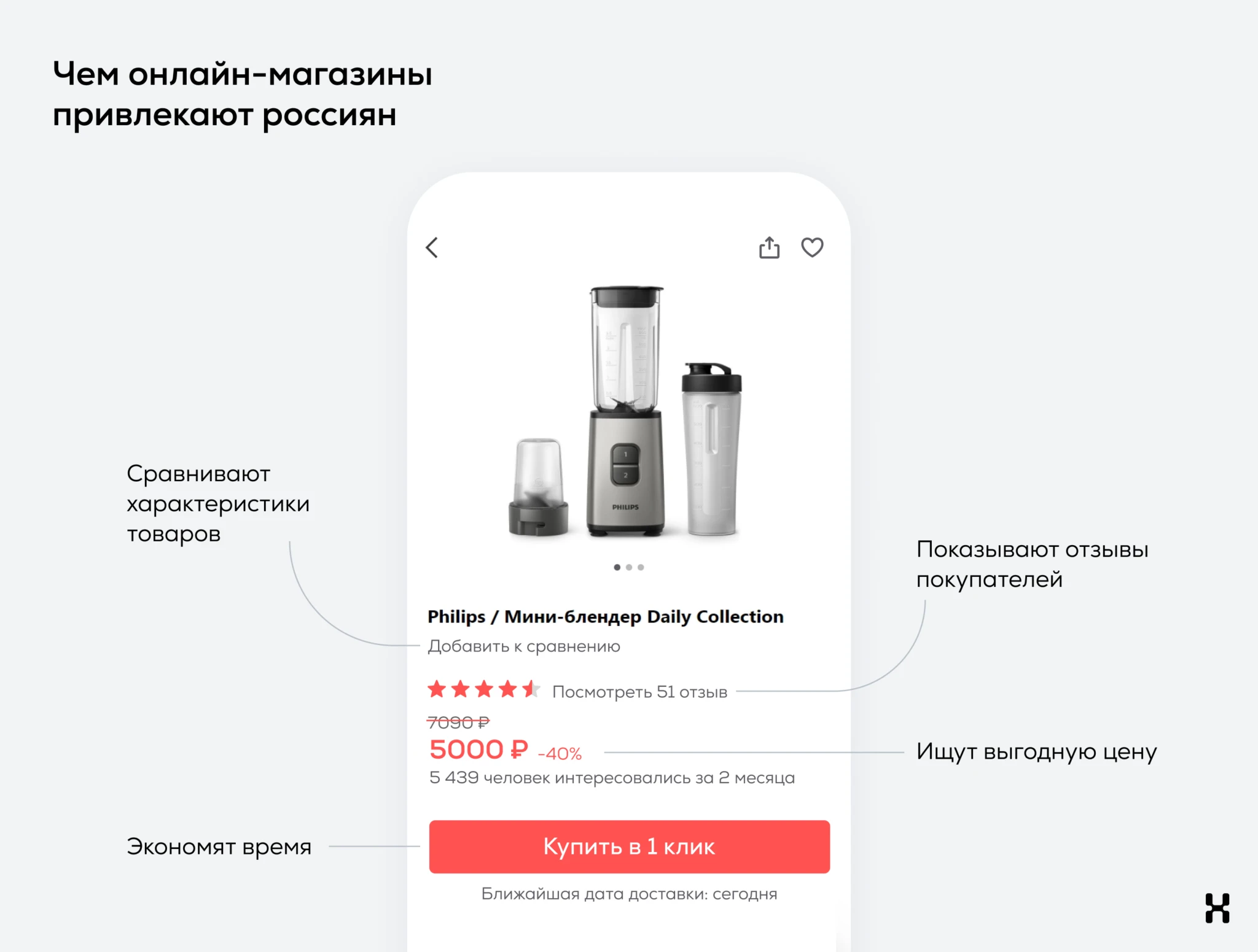 Представим, что Яндекс Маркет сделает все наоборот: поставит цены выше, чем в розничных магазинах, уберет отзывы о товарах, будет работать с 9:00 до 18:00, а обрабатывать заказы — по двое суток. В этом случае 58% пользователей уйдет на другие платформы или в офлайн, потому что онлайн-покупки в Маркете станут сложнее и дороже, чем поход в обычный магазин.