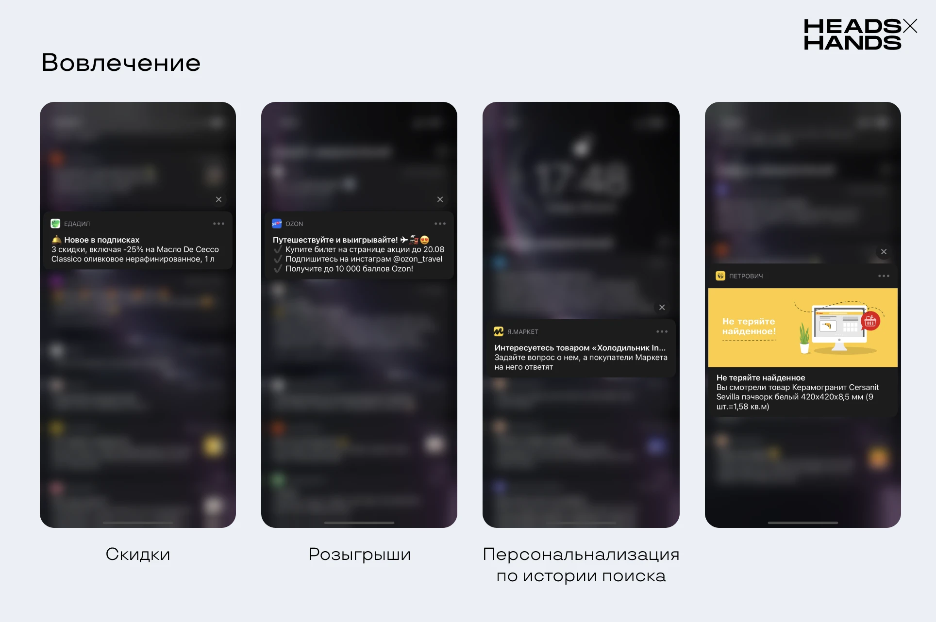 Уведомления, которые формируются на основе интересов пользователей: искомых товаров, понравившихся постов, прошлых покупок.