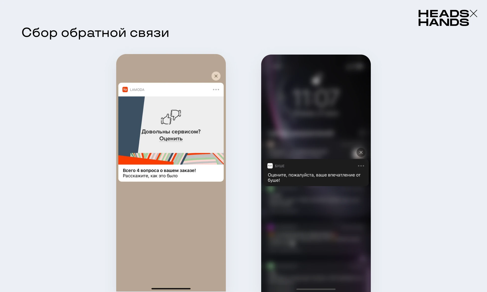 Уведомления, которые ведут на опросы: оценить заказ, обслуживание, написать отзыв о товаре. Служат для точечного сбора обратной связи и не предназначены, чтобы их отправляли на большие объемы пользователей.