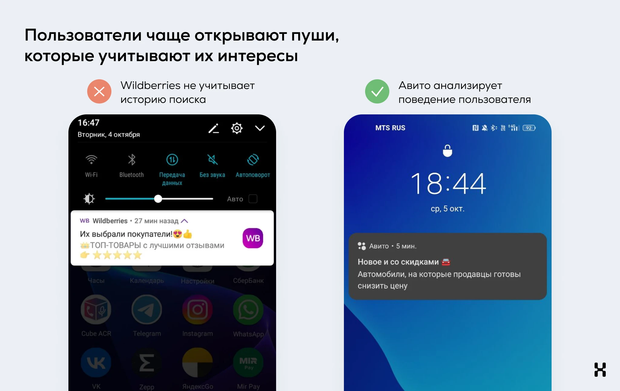 Пользователи чаще открывают уведомления, если видят, что они адресованы лично им. Например, Авито рассылает пуши исходя из действий пользователя в приложении: поиска, просмотров и добавлений в избранное. Если пользователь просматривал автомобили, Авито предлагает ему пуш с подборкой объявлений о продаже машин.