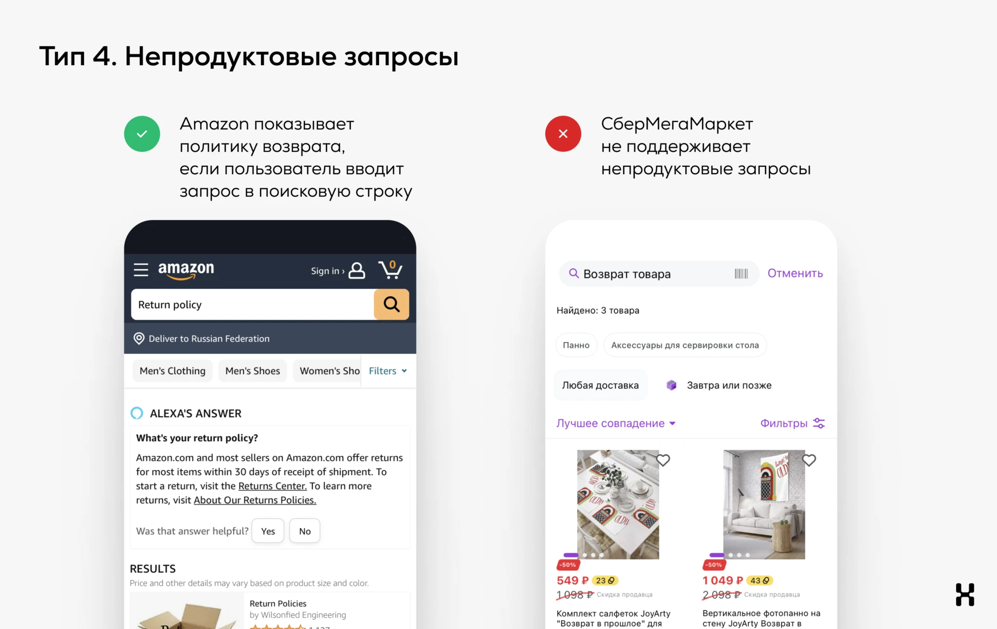 Что делает клиент. Использует непродуктовый запрос, то есть вводит «политика возврата» или «срок доставки» в поисковую строку.