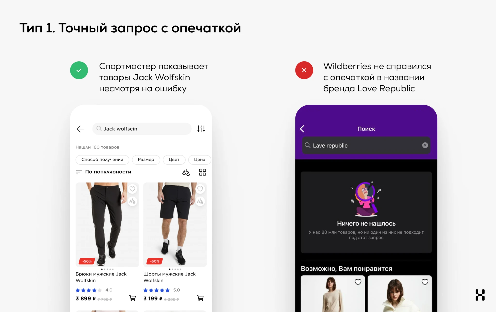 Каждый онлайн-магазин должен распознавать минимум 4 типа поисковых запросов: точный, сленговый, по виду и характеристике продукта. Это базовая функциональность ecommerce-сервисов: пользователи раздражаются, если ее нет, потому что не могут закрыть свою задачу.