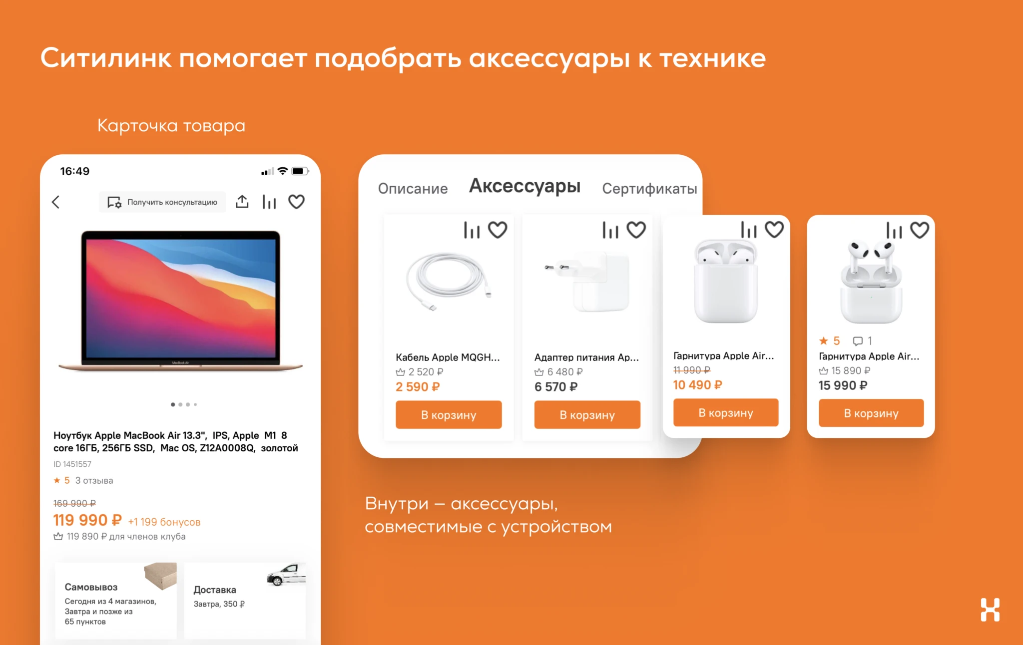 Чтобы помочь пользователю подобрать аксессуар или запчасть, нужно также добавить блок с рекомендованными товарами. Например, в приложении для Ситилинк мы добавили в карточку товара кабели, адаптеры и гарнитуры, совместимые с продуктом. Такой блок не только упрощает поиск клиенту, но и наращивает средний чек онлайн-магазина благодаря кросс-продажам.