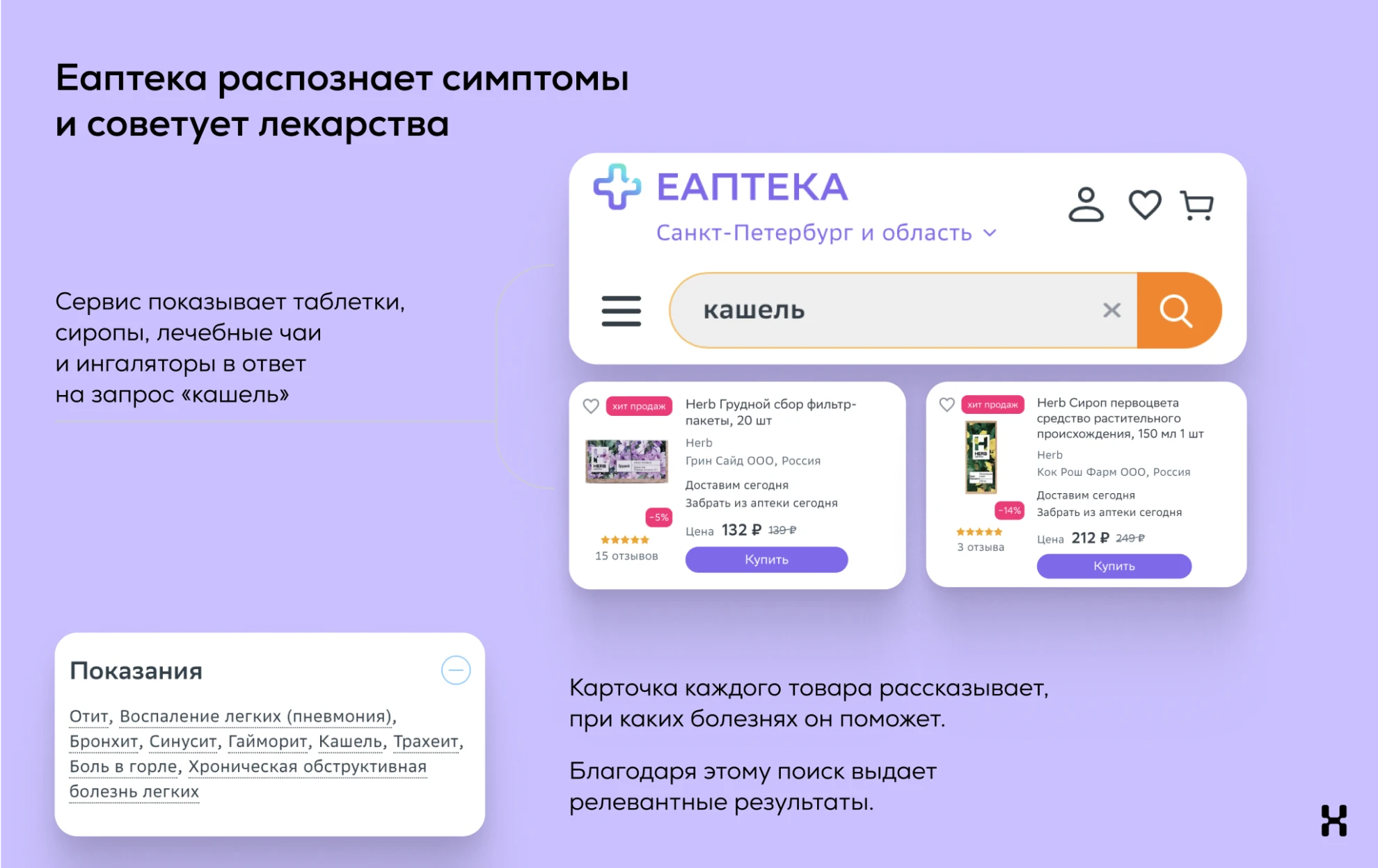 Благодаря этому поиск сможет распознать симптомный запрос и выдаст релевантный результат. Например, Еаптека знает, что посоветовать при простуде, а что — при гриппе.