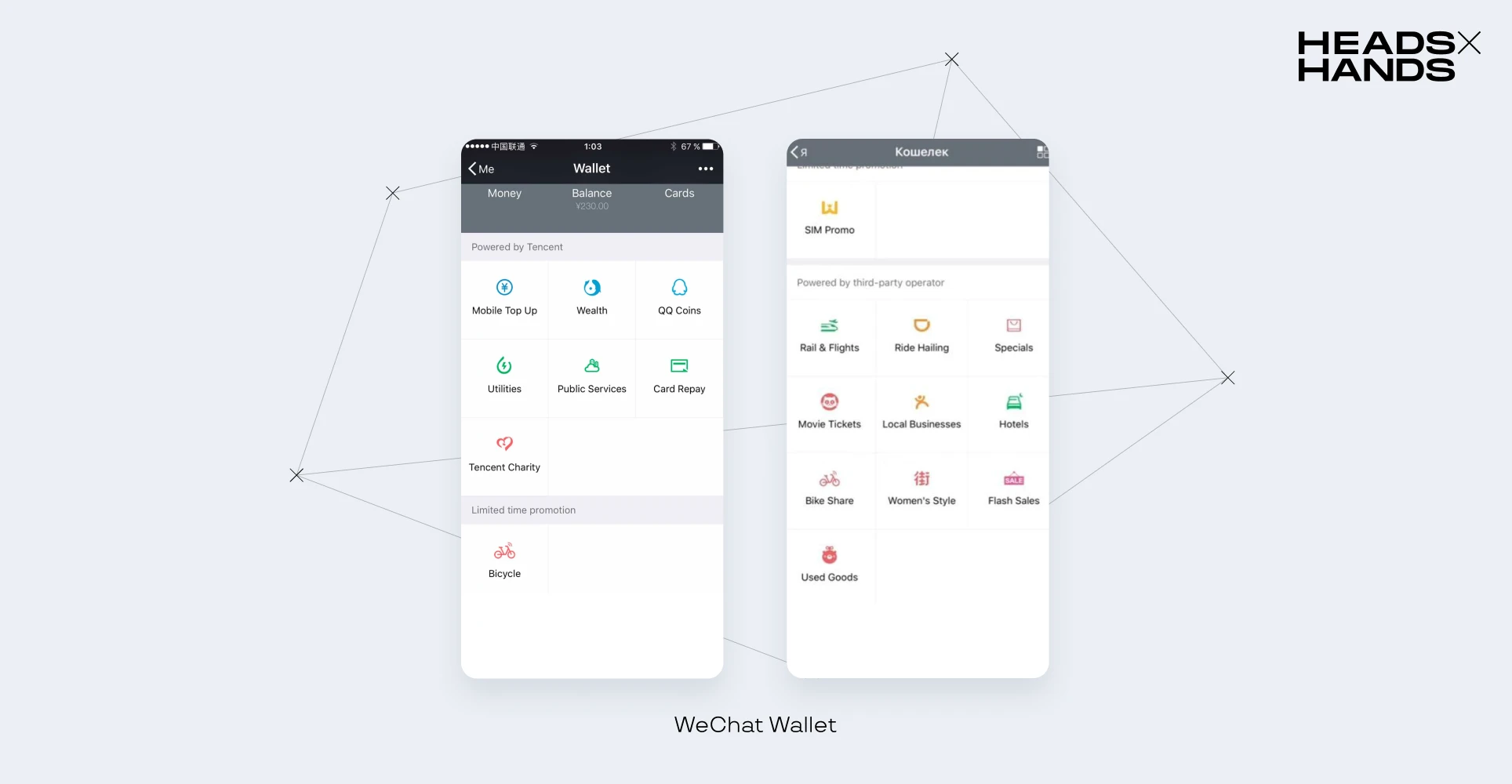 В кошельке WeChat Wallet можно пополнить мобильный баланс, оплатить домашний интернет, совершить денежный перевод, разделить счет, оплатить коммунальные услуги, пожертвовать на благотворительность, записаться к врачу и много другое. Там же есть быстрый доступ к некоторым мини-аппам: вызову такси, заказу еды, аренде велосипедов, покупке билетов в кино, на самолет или поезд, аренде номера в отеле и многому другому. Баланс кошелька можно пополнить с дебетовой карты китайского банка или получить перевод от другого пользователя.