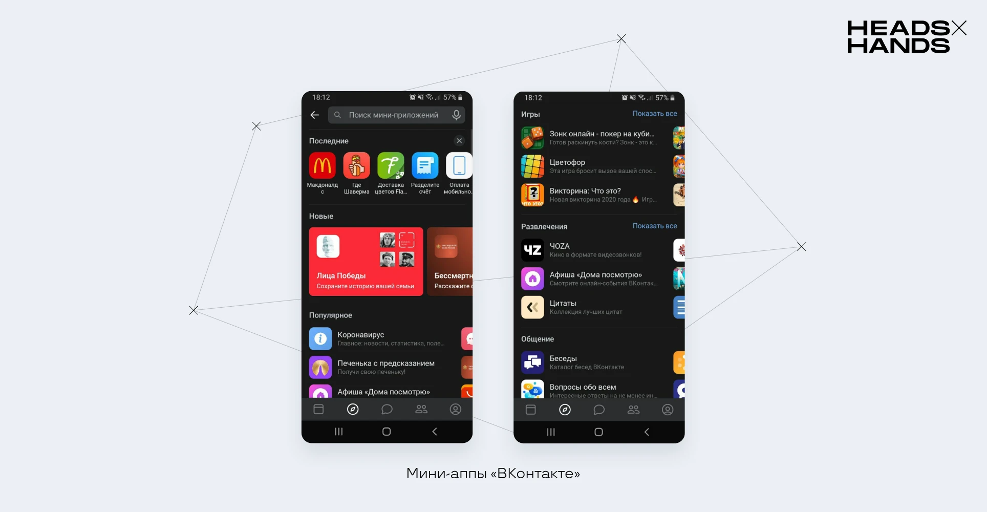 Через мини-аппы «ВКонтакте» можно пополнить проездной, сканировать чеки и получать кэшбек, читать книги, искать работу, авиабилеты или самую вкусную шаверму на районе и многое другое. Они пока не так тесно связаны с офлайном как мини-аппы в WeChat. Во «ВКонтакте» также, как и в китайском супер-аппе, можно заказать такси и еду. Мини-аппов ритейлеров и ресторанов пока немного, и они работают только на онлайн-покупки, доставку, промоакции. Тем не менее появляются спецпроекты, которые связывают соцсеть с офлайном через QR-коды, например, интерактивный выпуск журнала Cosmo или рекламный проект сезона «Орла и Решки. Ивлеева vs Бедняков», которая связала группу «ВКонтакте», телетрансляцию и наружную рекламу.