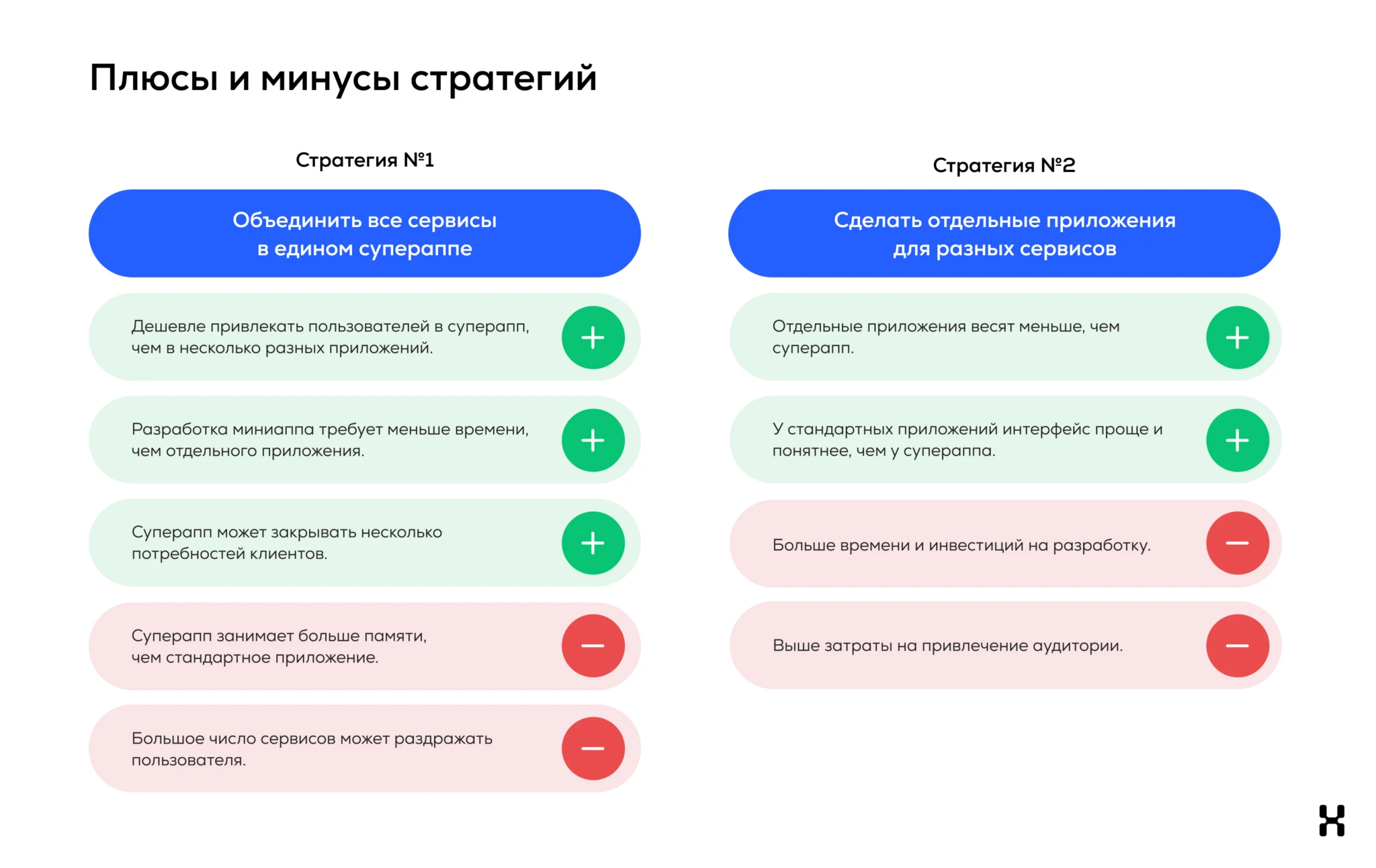 При построении экосистемы бизнес может придерживаться одной из двух стратегий — объединить новые сервисы в едином супераппе или запускать отдельные приложения для каждого из них.