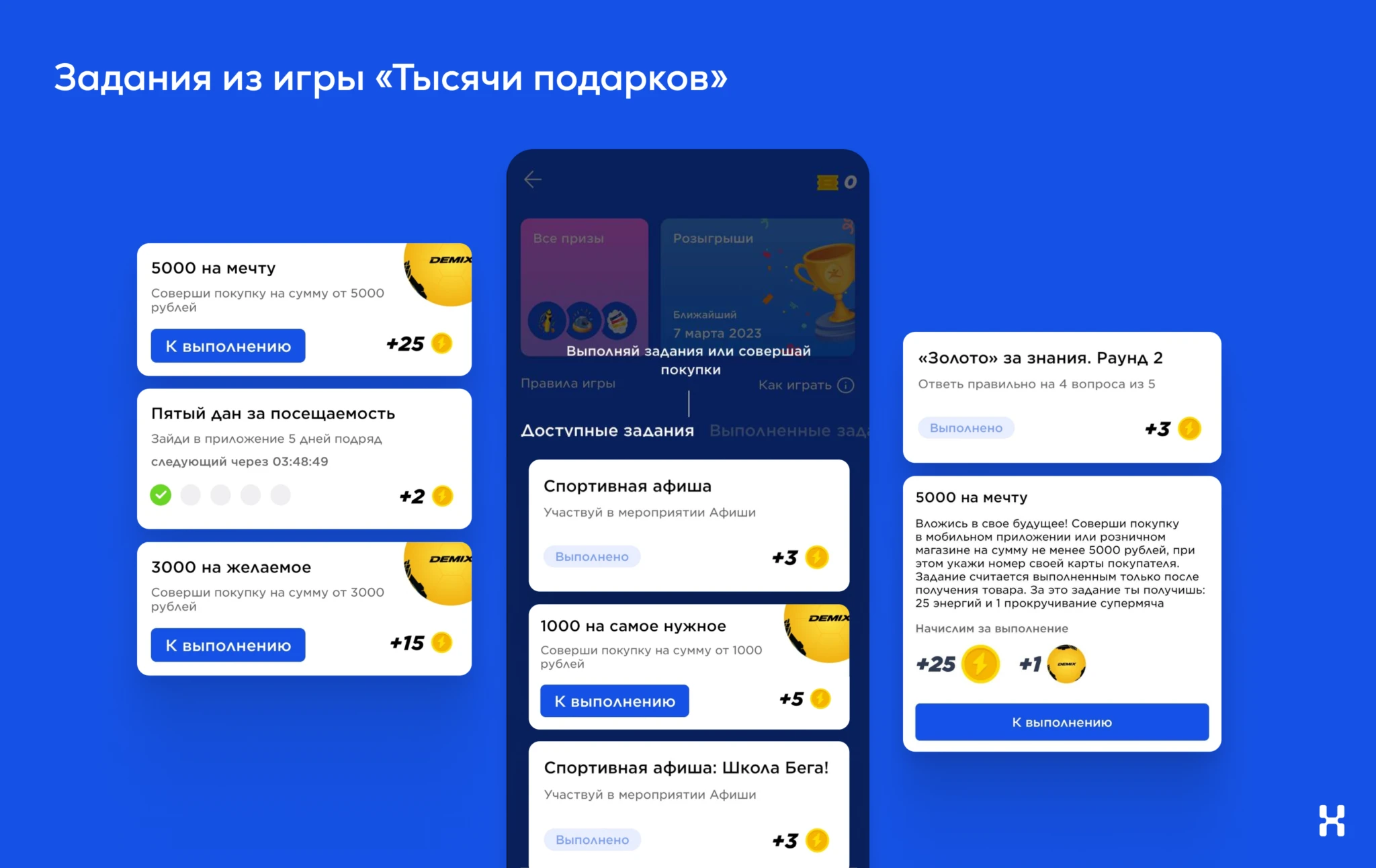 Спортмастер знакомил клиентов с новыми сервисами с помощью игровых заданий. Например, участник должен был посетить мероприятие из «Афиши», заняться спортом в «Онлайн тренировках» или прочитать статью в «Медиа». За выполнение заданий клиенты получали бонусы в программе лояльности, промокоды на скидки или бесплатную доставку.