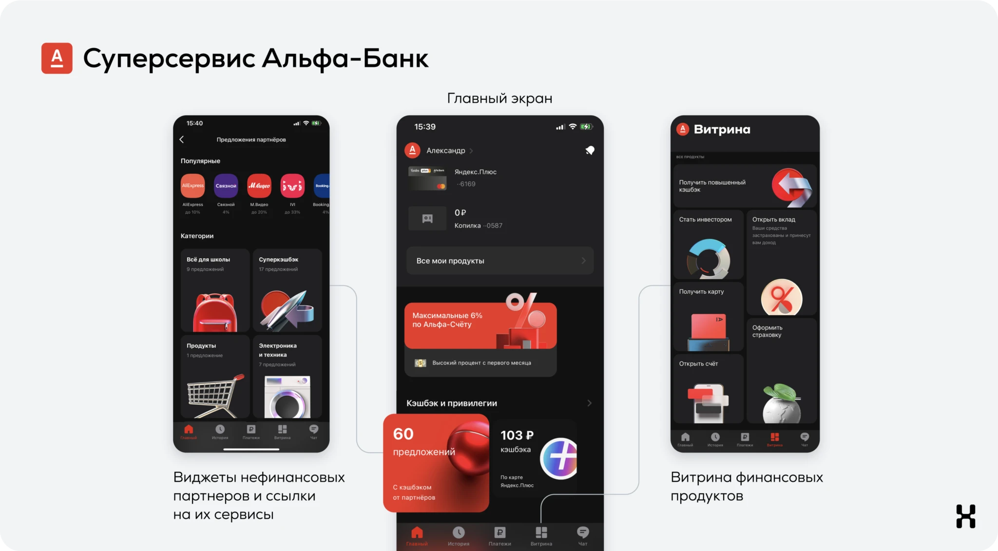Альфа-Банк собирается делать финансовый суперсервис, а значит объединять в нем только финансовые продукты: банкинг, сервис инвестиций, цифровую ипотеку, накопительные счета, мобильные кассы и прочие услуги. Поэтому в нем не будет нефинансовых сервисов. Все, что не связано с финансами будут развивать партнеры Альфа-Банка в собственных каналах продажах и интерфейсах.