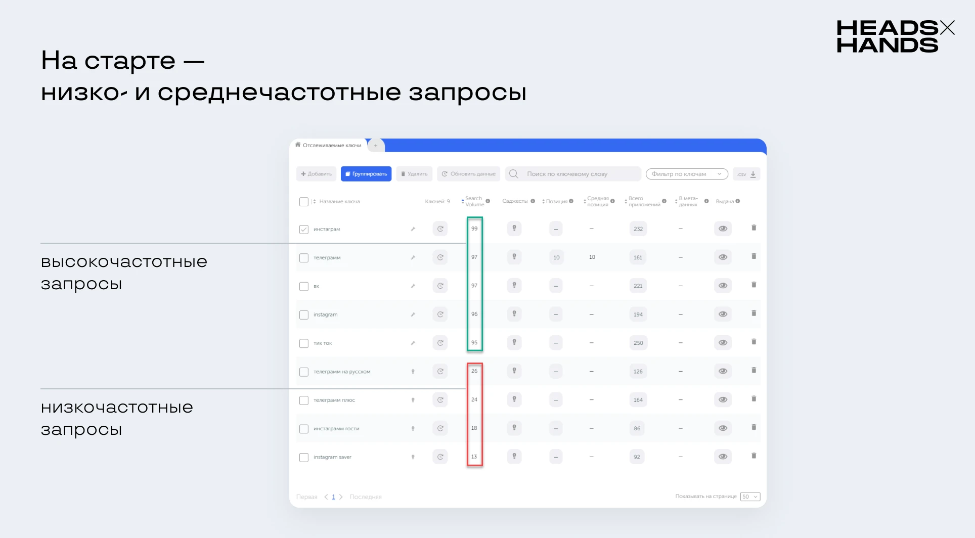 При запуске приложения не стоит ориентироваться на высокочастотные запросы, конкуренция по ним настолько высока, что вам вряд ли удастся бороться за высокие позиции.