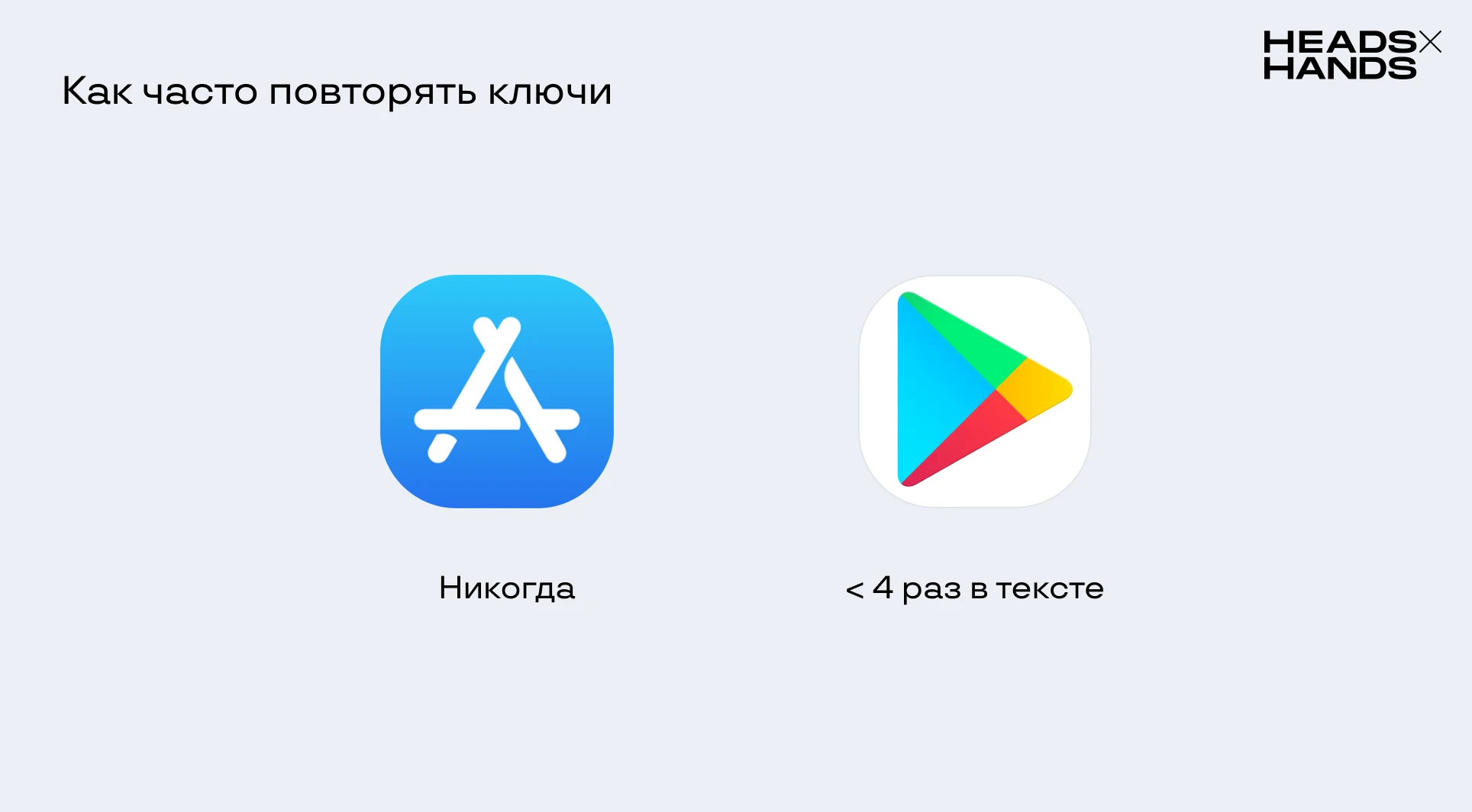 В App Store не повторяйте ключевые слова. Если вы использовали одно слово в одной из частей метаданных, то этого будет достаточно. App Store ранжирует небольшое количество текста, а все слова и так пересекаются и образовывают бесконечное количество словосочетаний и фраз.