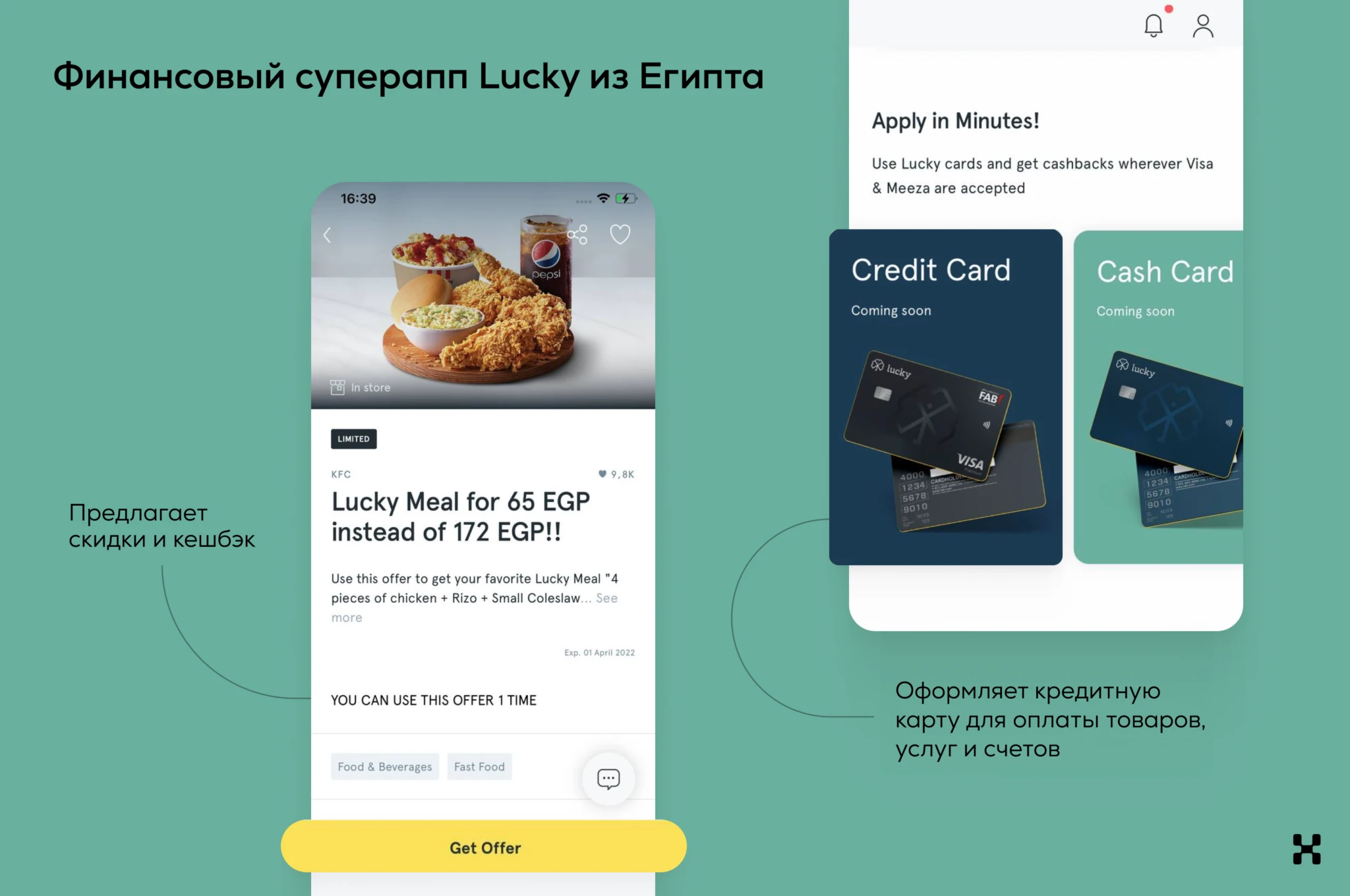 Lucky — суперапп, который предлагает пользователям финансовые услуги, скидки и кешбэк до 50% на местные и мировые бренды. Он объединяет 10 000 партнеров, в том числе Nike, KFC, Booking и New Balance.