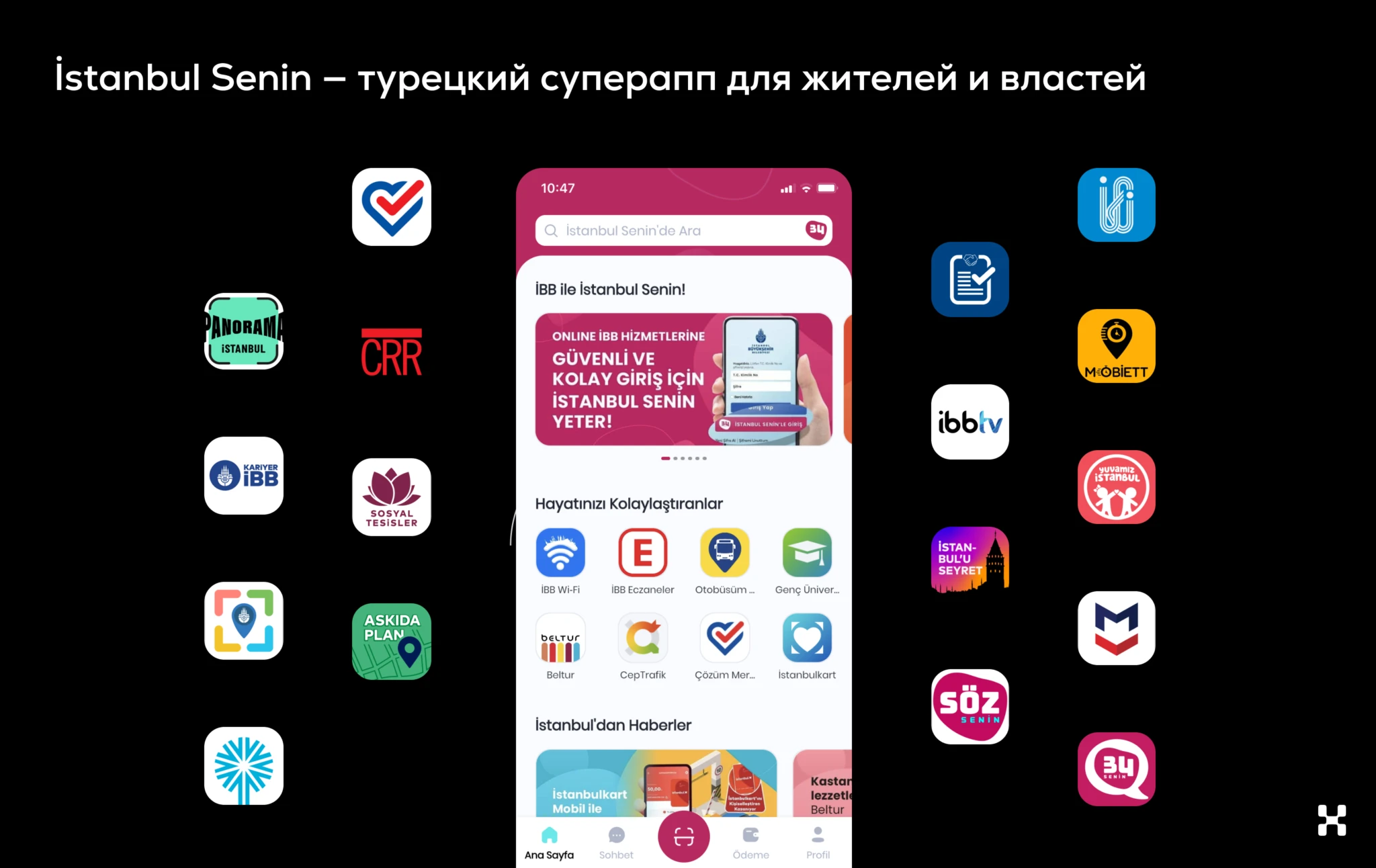 İstanbul Senin — турецкий суперапп, который работает в Стамбуле и объединяет 40 мини-приложений. Турецкие власти собрали городские, платежные и образовательные сервисы в едином интерфейсе.