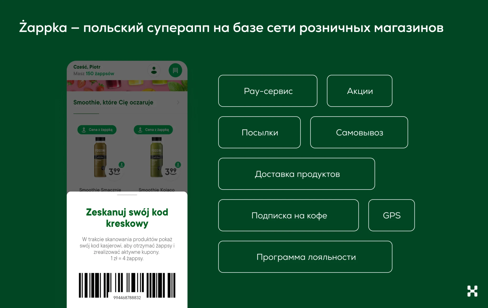 Żabka — крупнейшая сеть минимаркетов в Польше. У Żabka 9 тысяч магазинов, 8 тысяч партнеров и 15 млн клиентов. Сеть стала игроком, задающим тренды на рынке розничной торговли. Чтобы сохранить это положение, естественным шагом было выйти в онлайн. Тогда компания запустила онлайн-сервисы для бесконтактной оплаты покупок, доставку продуктов, пропуск в бескассовый магазин и объединила их в супераппе Żappka.