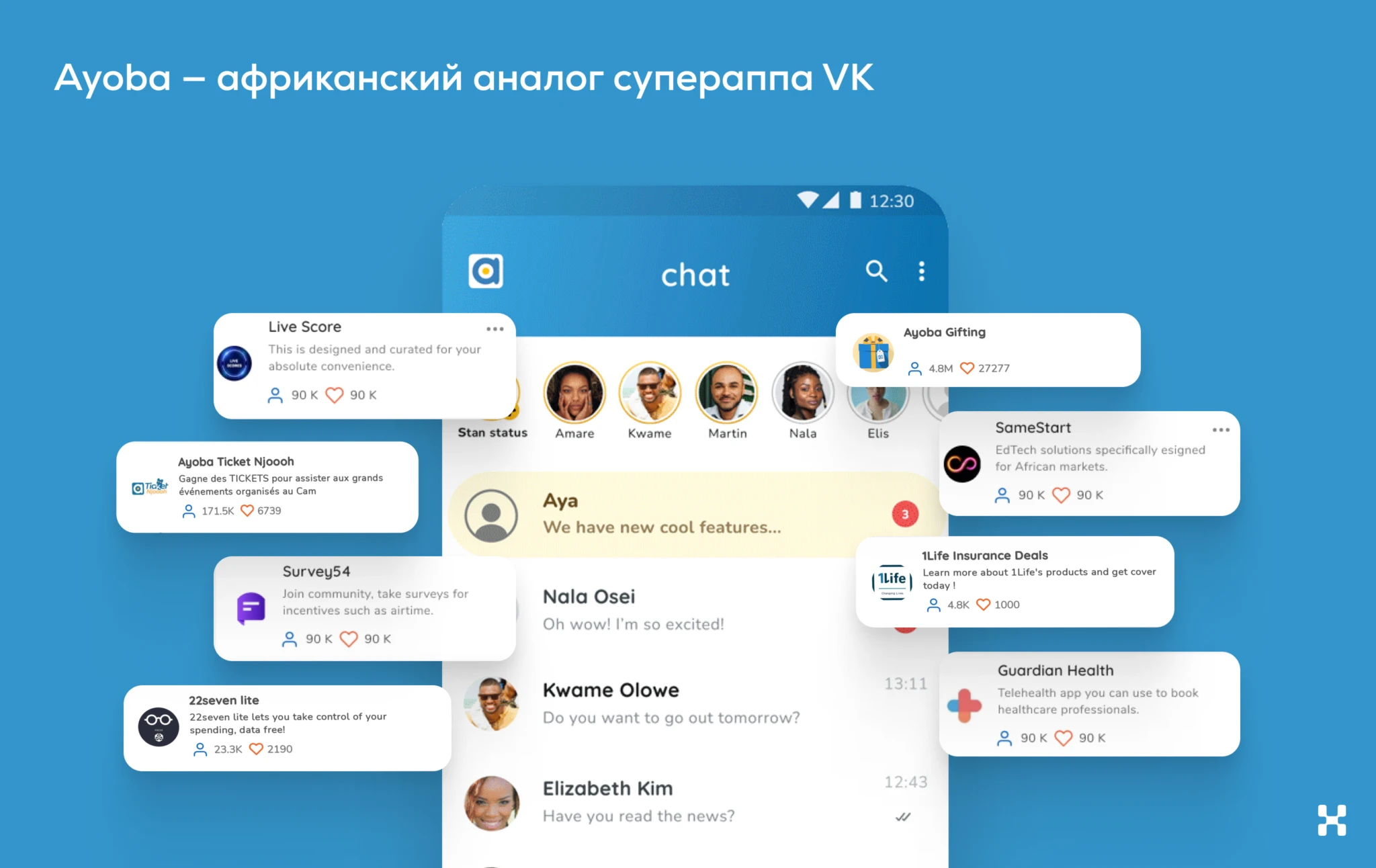 Ayoba — африканская платформа, который развивается по модели VK: запускает миниаппы и эволюционирует из социальной сети в суперапп.