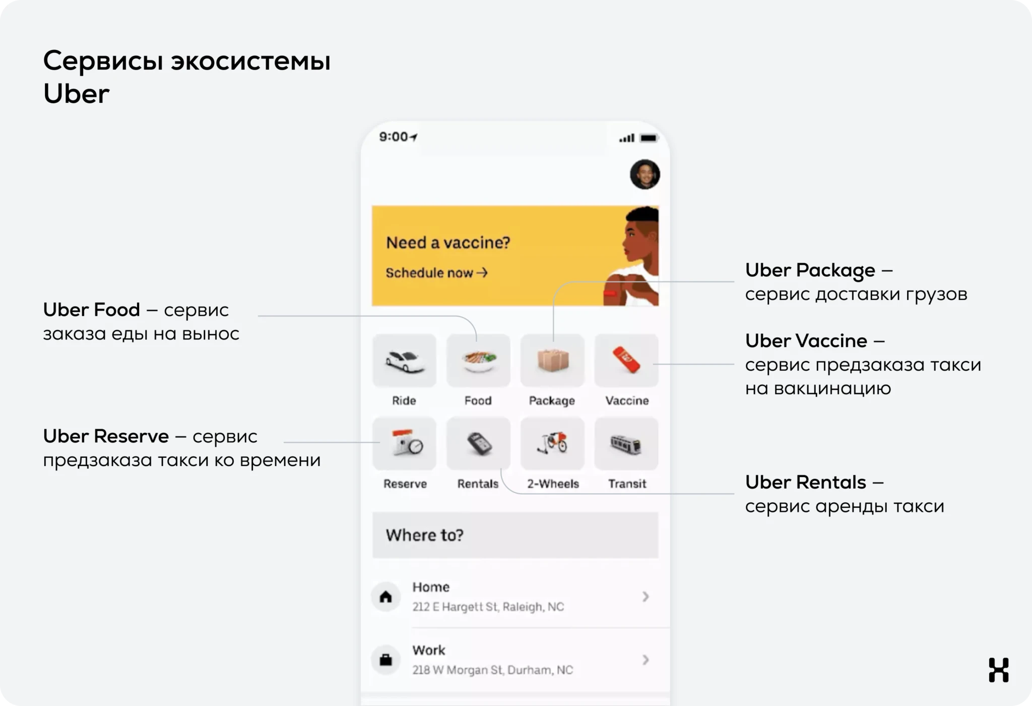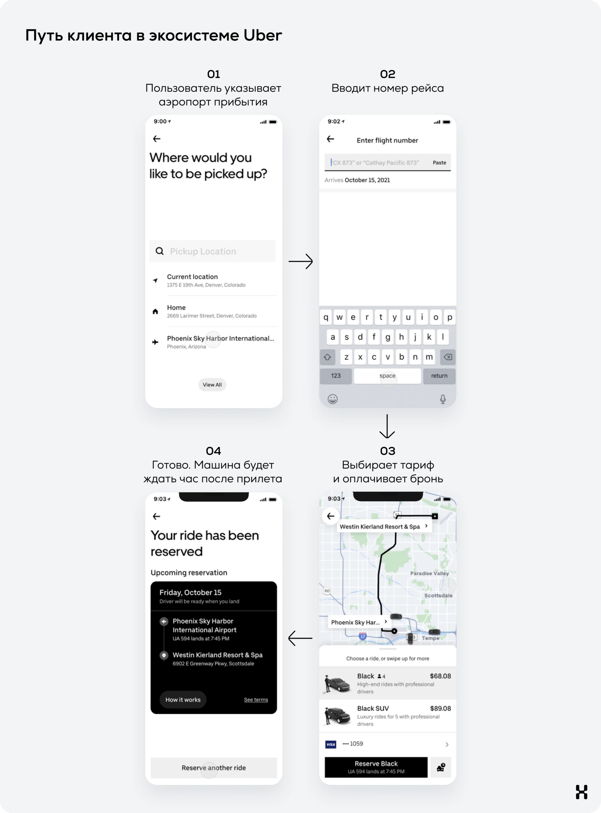 Uber учит клиентов использовать свои сервисы параллельно и бесшовно. Например, Uber Reserve помогает заказать такси в привязке к авиарейсу: пользователь может забронировать поездку за 30 дней до нее. Он указывает аэропорт, из которого его нужно забрать, выбирает пункт назначения, указывает номер рейса и оплачивает бронь. Водитель ждет его по прилету в течение часа, даже если самолет задержали.