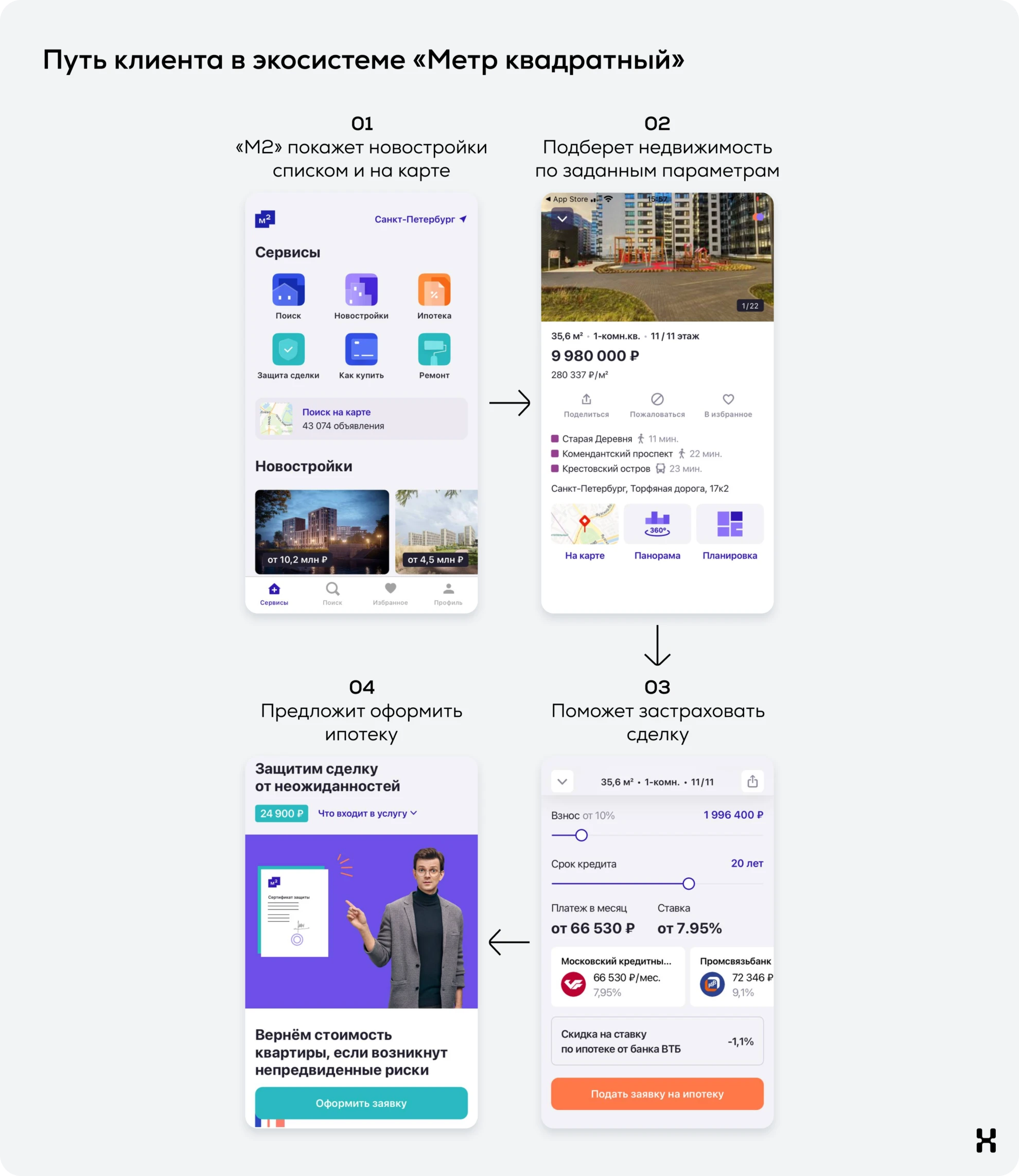 Вертикальная экосистема «Метр квадратный» закрывает основные потребности при покупке жилья по вертикали: от поиска жилья до ремонта в новой квартире. Сервисы связаны в единый цифровой клиентский путь и обеспечивают постоянный контроль за состоянием сделки. Например, приложение «М2» умеет подбирать недвижимость в рамках бюджета, оформлять ипотеку и страховать сделку.
