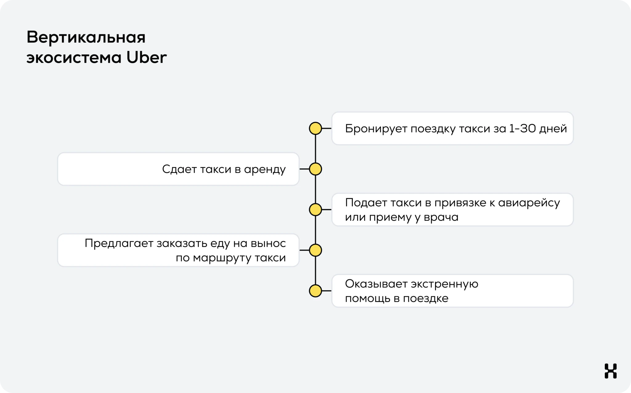 Укрепили лояльность пользователей. Вертикальная экосистема выстраивает более глубокие отношения с клиентами, потому что ее сервисы помогают клиенту на всех этапах до закрытия потребности. Это удерживает старых и привлекает новых клиентов. Например, c 2017 года база активных пользователей Uber растет на 49% в год.