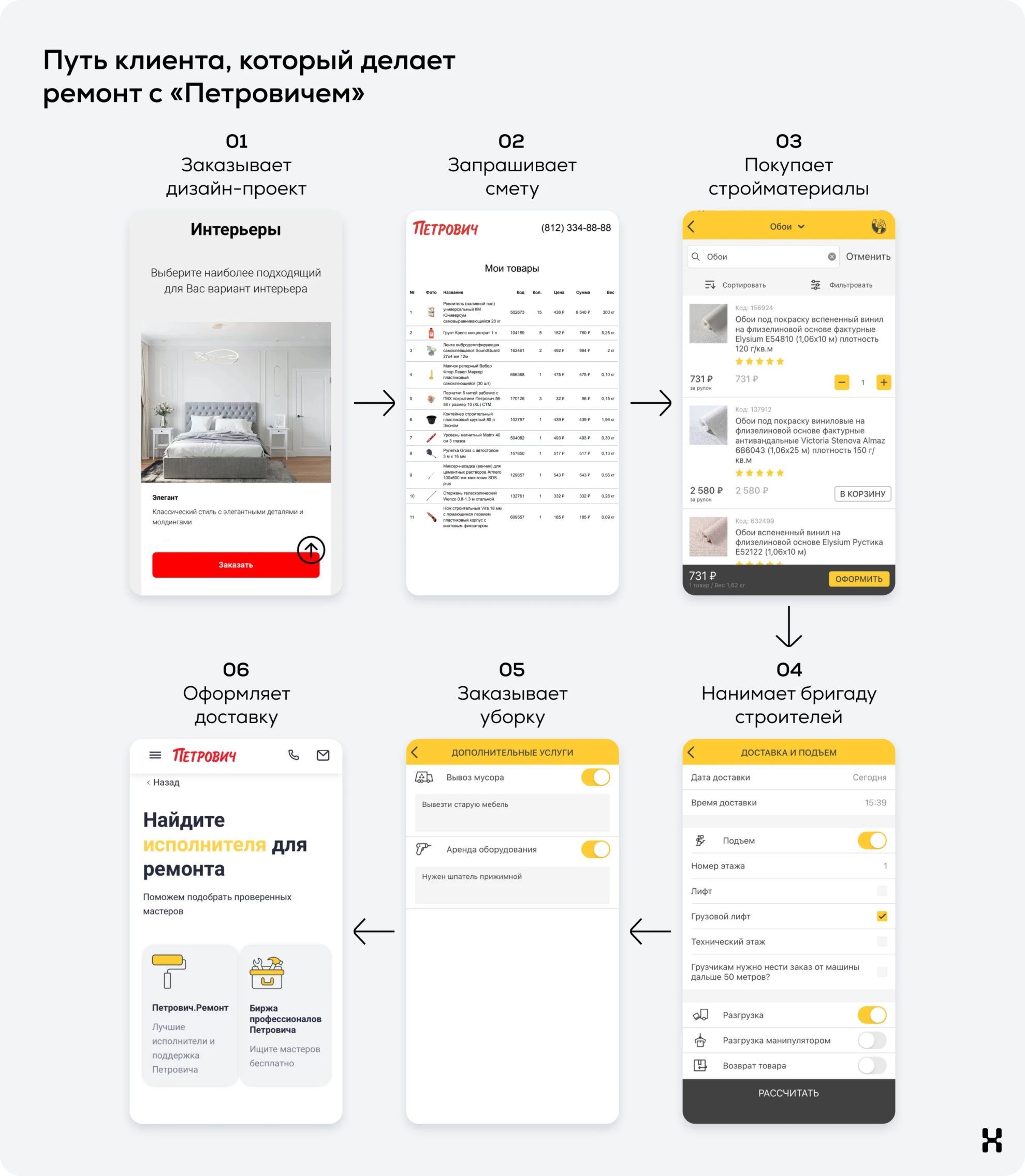 Ключевой продукт компании — строительные материалы. «Петрович» выстроил цепочку сервисов и охватил весь путь обустройства жилья: от момента, когда клиент захотел сменить обстановку в квартире, до момента, когда он смотрит на новенький ремонт и пьет чай.