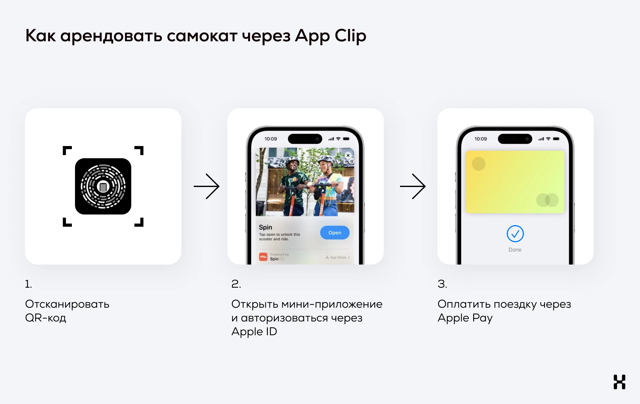Пример. Раньше, чтобы арендовать самокат, пользователю нужно было скачать приложение, зарегистрироваться в нем и привязать банковскую карту. C App Clip все проще и быстрее: он сканирует QR-код с самоката, авторизуется в мини-приложении через Apple ID и оплачивает поездку с помощью Apple Pay.