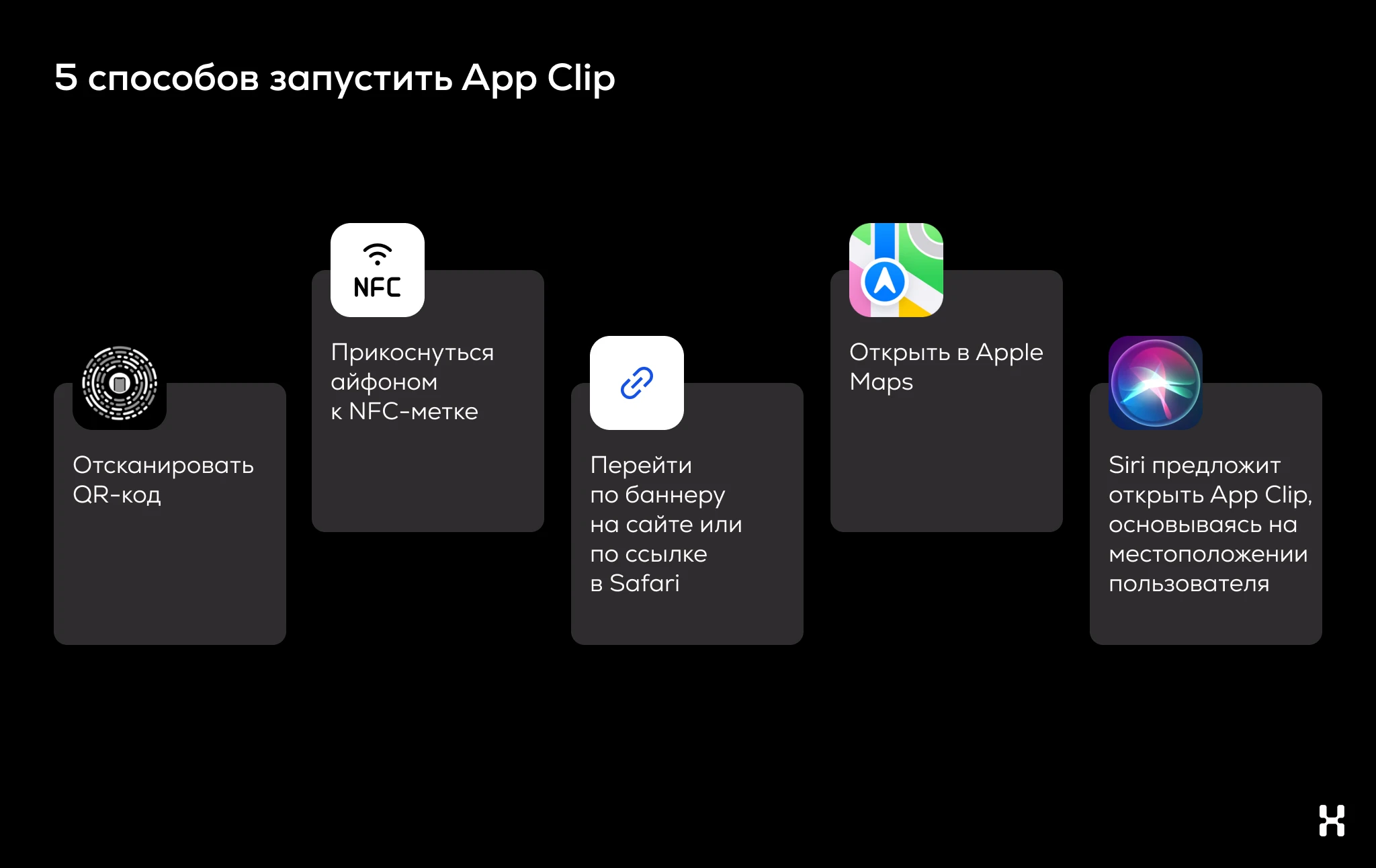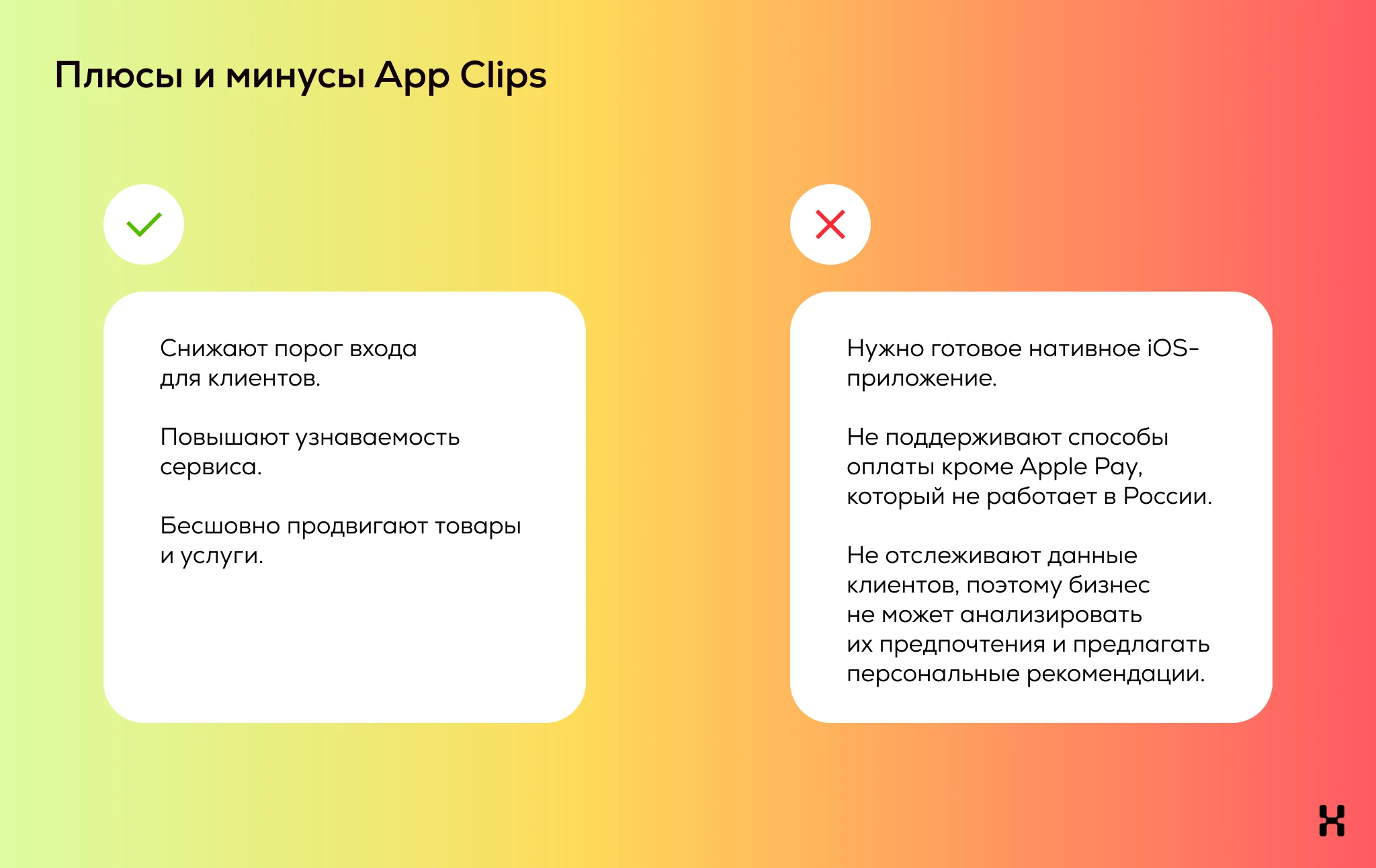 App Clips — мини-приложения, которые не надо устанавливать из стора. Их запускают ритейлеры, рестораны и агрегаторы доставки, сервисы парковки и аренды самокатов. Так они пытаются снизить порог входа для клиентов и повысить узнаваемость сервисов. Но в России App Clips не стали популярными из-за отсутствия альтернативных способов оплаты и проблем с аналитикой.